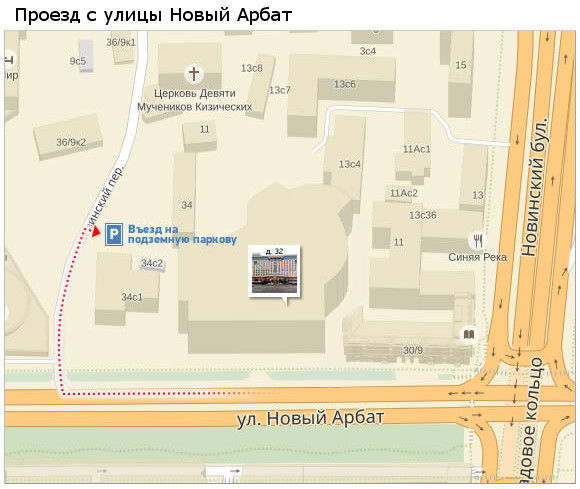 С улицы Новый Арбат нужно повернуть направо на Новинский переулок. Далее можно припарковаться там или заехать в подземную парковку (схемы ниже)