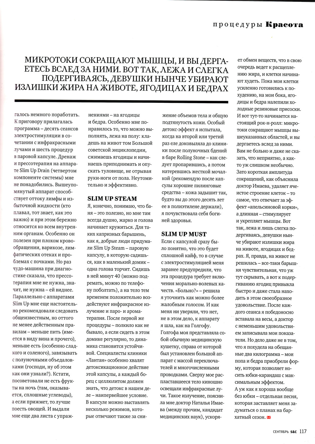 Slim Up - это система, состоящая из четырех компонентов. Во-первых, это диагностический аппарат - здоровая такая штуковина, которая включает в себя компьютер, экран и двухметровый агрегат со сканером, весами и устройством для измерения объемов. Узнав мой вес, возраст, пол, а также размер бедер, рук, ног, талии и груди и соединив это все с информацией о моей мышечной массе, количестве жидкости в организме и жировой прослойке, чудо-машина выдала приговор: застой жидкости в тканях невелик, но два лишних килограмма (на мой взгляд, четыре) и недостаточный тонус в мышцах имеются. Как и целлюлит на ягодицах. С руками тоже предлагалось немного поработать. К приговору прилагалась программа - десять сеансов электростимуляции в сочетании с инфракрасными лучами и шесть процедур в паровой капсуле. Дренаж и прессотерапия на аппарате Slim Up Drain (четвертом компоненте системы) мне не понадобились. Вышеупомянутый аппарат способствует оттоку лимфы и избыточной жидкости (кто плавал, тот знает, как это важно) и при этом бережно относится ко всем внутренним органам. Особенно он полезен при плохом кровообращении, варикозе, лимфатических отеках и проблемах с почками. Но раз чудо-машина при диагностике сказала, что прессотерапия мне не нужна, значит, не нужна - ей виднее. Параллельно с аппаратами Slim Up мне еще настоятельно рекомендовали следовать общеизвестным, но оттого не менее действенным правилам - меньше пить (имеется в виду вина и прочего), меньше есть (особенно сладкого и соленого), завязывать с полуночными объедаловками (господи, ну об этом как они узнали?). Кстати, посоветовали не есть фрукты на ночь (там, оказывается, сплошные углеводы), а если прижмет, то лучше поесть овощей. И выдали мне еще два листа с упражнениями - на ягодицы и бедра. Особенно мне понравилось то, что можно выполнять, лежа на полу: кладешь на живот том Большой советской энциклопедии, сжимаешь ягодицы и начинаешь приподнимать и опускать туловище, не отрывая руки-ноги от пола. Неутомительно и эффективно.