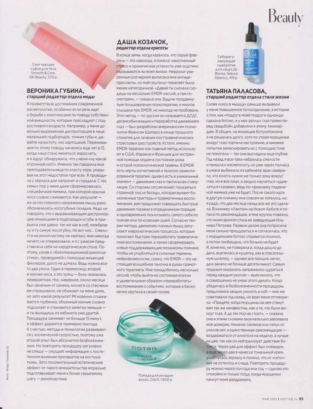 Слова «укол в мышцу» раньше вызывали у меня повышенное потоотделение, а истории о том, как «подруга моей подруги однажды сделала ботокс, и у нее заплыл глаз прямо перед свадьбой» добавляли к этому тахикардию. В общем, на инъекции ботулотоксина я не решалась долго, хотя по утрам морщинки вокруг глаз портили настроение, и никакие попытки замаскировать их с помощью тона не помогали — так они выглядели еще глубже. Год назад я все-таки набралась смелости и пришла к косметологу, но уже через полчаса в ужасе выбежала из кабинета: врач заверила, что колоть нужно не только зону вокруг глаз, но и все лицо, а заодно научиться «удивляться глазами», ведь по-прежнему подвижной мимика уже не будет. После такого идти в другую клинику мне совсем не хотелось, но я рада, что два месяца назад все же это сделала. В клинику «Лантан» на Новом Арбате я попала по рекомендации, и мне крупно повезло, что моим врачом стала ее заведующая Ильмира Петрова. Первым делом она попросила меня сильно прищуриться и согласилась, что с морщинками ботокс справится отлично, а потом пообещала, что больно не будет.