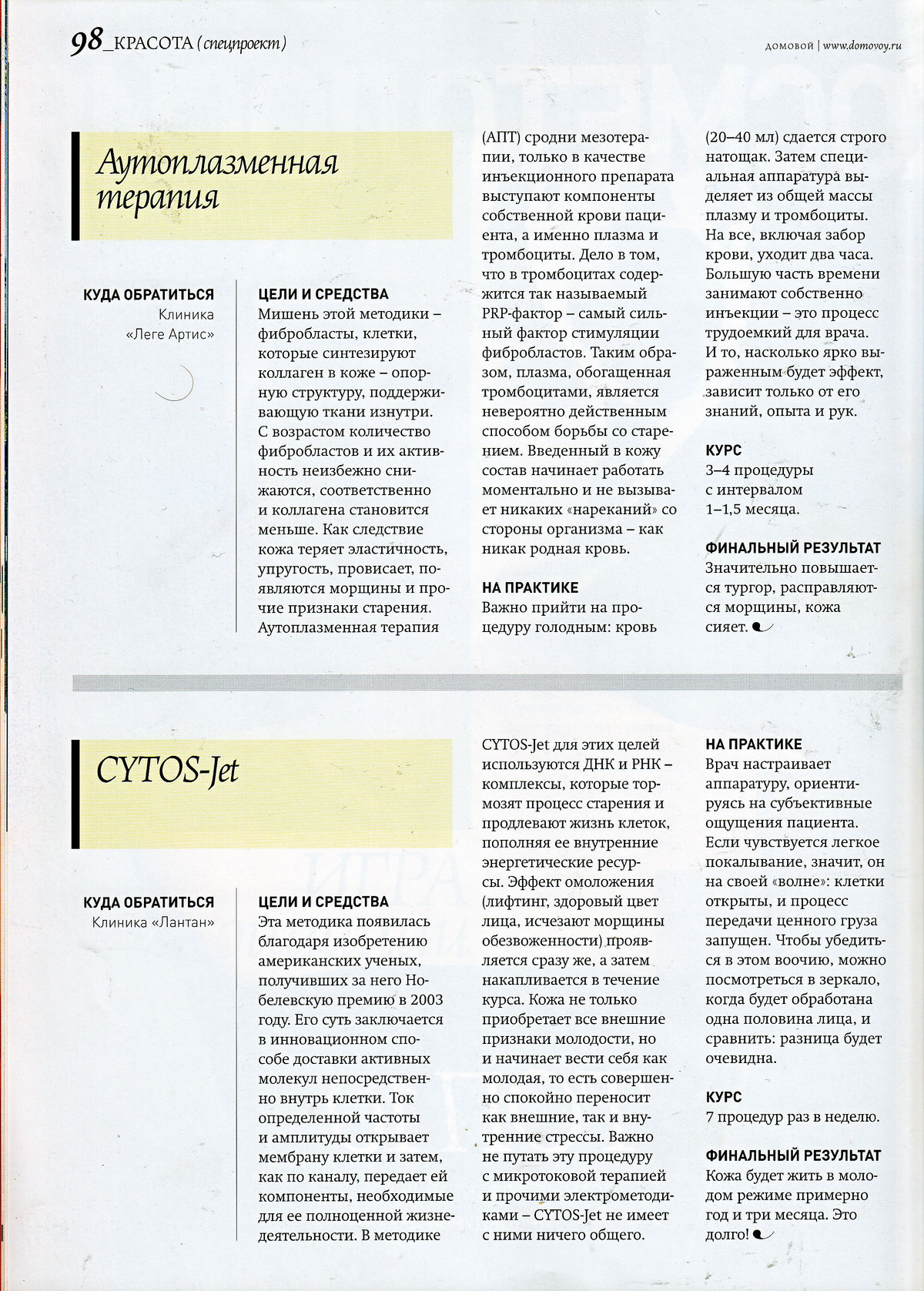 Эта методика появилась благодаря изобретению американских ученых, получивших за него Нобелевскую премию в 2003 году. Его суть заключается в инновационном способе доставки активных молекул непосредственно внутрь клетки. Ток определенной частоты и амплитуды открывает мембрану клетки и затем, как по каналу, передает ей компоненты, необходимые для ее полноценной жизнедеятельности. В методике CYTOS-Jet для этих целей используются ДНК и РНК -комплексы, которые тормозят процесс старения и продлевают жизнь клеток, пополняя ее внутренние энергетические ресурсы. Эффект омоложения (лифтинг, здоровый цвет лица, исчезают морщины обезвоженности) проявляется сразу же, а затем накапливается в течение курса. Кожа не только приобретает все внешние признаки молодости, но и начинает вести себя как молодая, то есть совершенно спокойно переносит как внешние, так и внутренние стрессы. Важно не путать эту процедуру с микротоковой терапией и прочими электрометодиками - CYTOS-Jet не имеет с ними ничего общего.