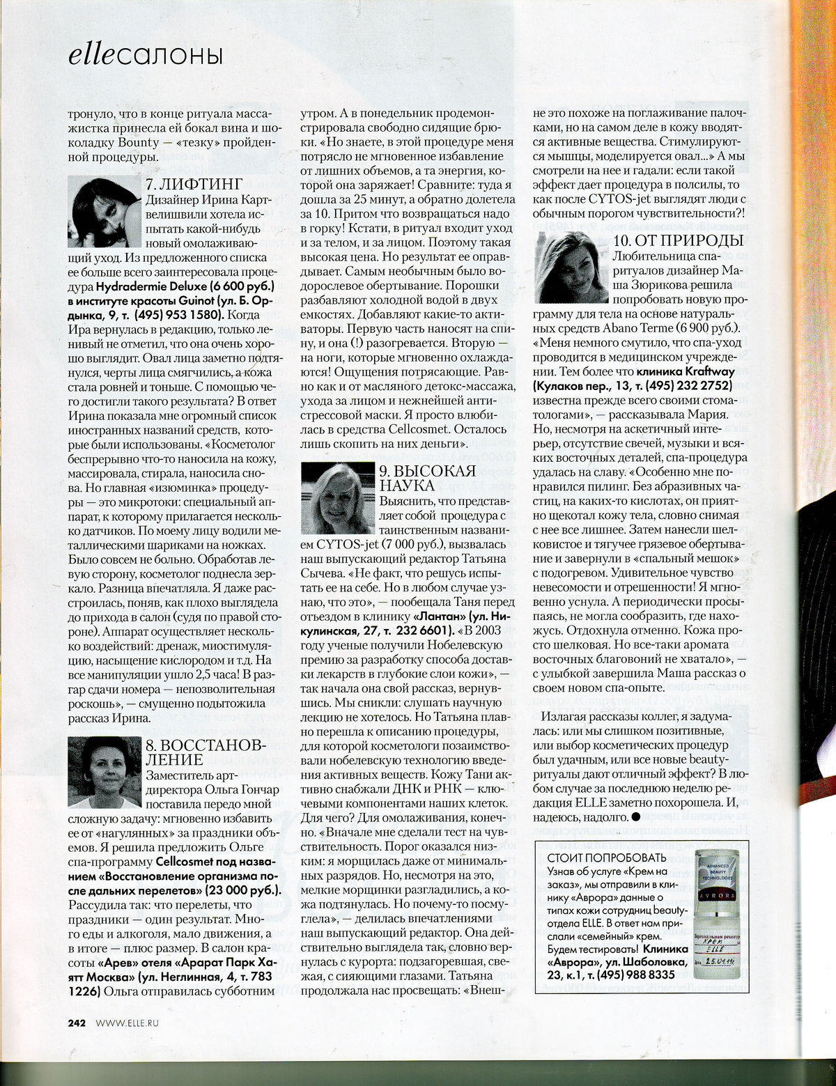 Выяснить, что представляет собой процедура с таинственным названием CYTOS-jet (7 000 руб.), вызвалась наш выпускающий редактор Татьяна Сычева. «Не факт, что решусь испытать ее на себе. Но в любом случае узнаю, что это», — пообещала Таня перед отъездом в клинику «Лантан» (ул. Никулинская, 27, т. 232 6601). «В 2003 году ученые получили Нобелевскую премию за разработку способа доставки лекарств в глубокие слои кожи», — так начала она свой рассказ, вернувшись. Мы сникли: слушать научную лекцию не хотелось. Но Татьяна плавно перешла к описанию процедуры, для которой косметологи позаимствовали нобелевскую технологию введения активных веществ. Кожу Тани активно снабжали ДНК и РНК — ключевыми компонентами наших клеток. Для чего? Для омолаживания, конечно. «Вначале мне сделали тест на чувствительность. Порог оказался низким: я морщилась даже от минимальных разрядов. Но, несмотря на это, мелкие морщинки разгладились, а кожа подтянулась. Но почему-то посмуглела», — делилась впечатлениями наш выпускающий редактор. Она действительно выглядела так, словно вернулась с курорта: подзагоревшая, свежая, с сияющими глазами. Татьяна продолжала нас просвещать: «Внешне это похоже на поглаживание палочками, но на самом деле в кожу вводятся активные вещества. Стимулируются мышцы, моделируется овал...» А мы смотрели на нее и гадали: если такой эффект дает процедура в полсилы, то как после CYTOS-jet выглядят люди с обычным порогом чувствительности?!