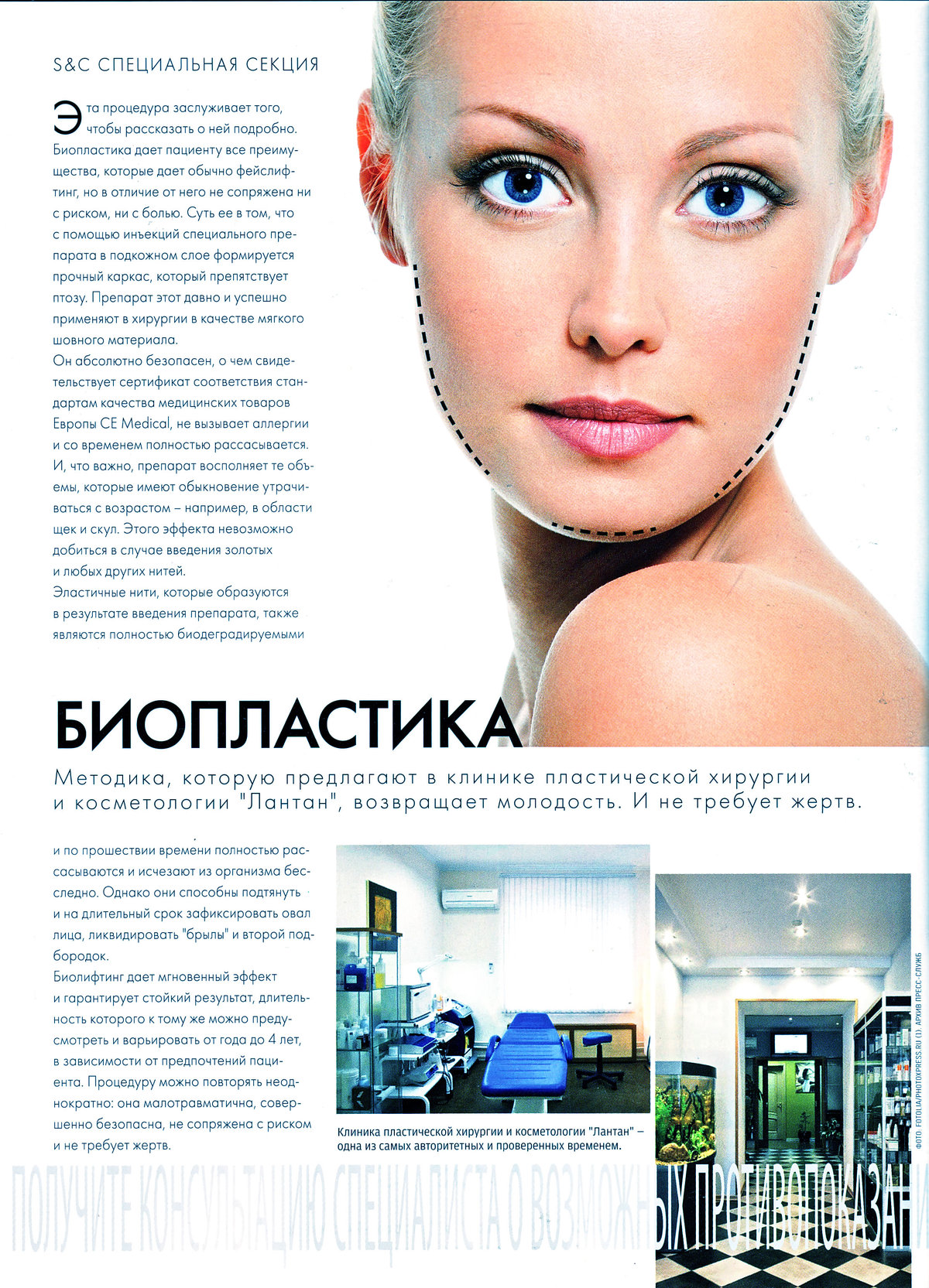 Эта процедура заслуживает того, чтобы рассказать о ней подробно. Биопластика дает пациенту все преимущества, которые дает обычно фейслифтинг, но в отличие от него не сопряжена ни с риском, ни с болью. Суть ее в том, что с помощью инъекций специального препарата в подкожном слое формируется прочный каркас, который препятствует птозу. Препарат этот давно и успешно применяют в хирургии в качестве мягкого шовного материала. Он абсолютно безопасен, о чем свидетельствует сертификат соответствия стандартам качества медицинских товаров Европы СЕ Medical, не вызывает аллергии и со временем полностью рассасывается. И, что важно, препарат восполняет те объемы, которые имеют обыкновение утрачиваться с возрастом - например, в области щек и скул. Этого эффекта невозможно добиться в случае введения золотых и любых других нитей. Эластичные нити, которые образуются в результате введения препарата, также являются полностью биодеградируемыми и по прошествии времени полностью рассасываются и исчезают из организма бесследно. Однако они способны подтянуть и на длительный срок зафиксировать овал лица, ликвидировать "брылы" и второй подбородок. Биолифтинг дает мгновенный эффект и гарантирует стойкий результат, длительность которого к тому же можно предусмотреть и варьировать от года до 4 лет, в зависимости от предпочтений пациента. Процедуру можно повторять неоднократно: она малотравматична, совершенно безопасна, не сопряжена с риском и не требует жертв.