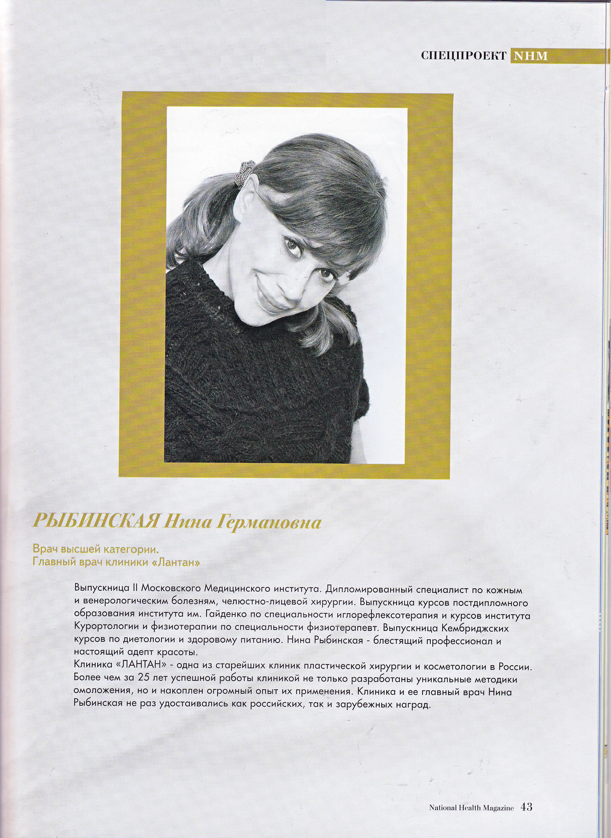 Выпускница II Московского Медицинского института. Дипломированный специалист по кожным и венерологическим болезням, челюстно-лицевой хирургии. Выпускница курсов постдипломного образования института им. Гайденко по специальности иглорефлексотерапия и курсов института Курортологии и физиотерапии по специальности физиотерапевт. Выпускница Кембриджских курсов по диетологии и здоровому питанию. Нина Рыбинская - блестящий профессионал и настоящий адепт красоты.