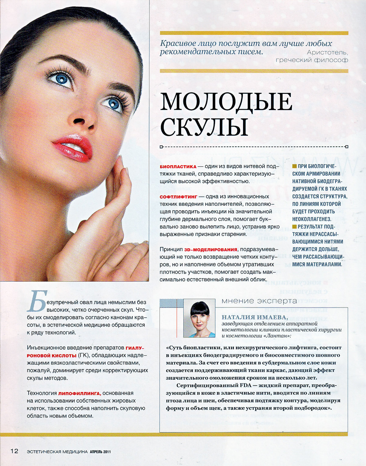 «Суть биопластики, или нехирургического лифтинга, состоит в инъекциях биодеградируемого и биосовместимого шовного материала. За счет его введения в субдермальном слое кожи создается поддерживающий ткани каркас, дающий эффект значительного омоложения сроком на несколько лет. Сертифицированный FDA — жидкий препарат, преобразующийся в коже в эластичные нити, вводится по линиям птоза лица и шеи, обеспечивая подтяжку контура, моделируя форму и объем щек, а также устраняя второй подбородок».