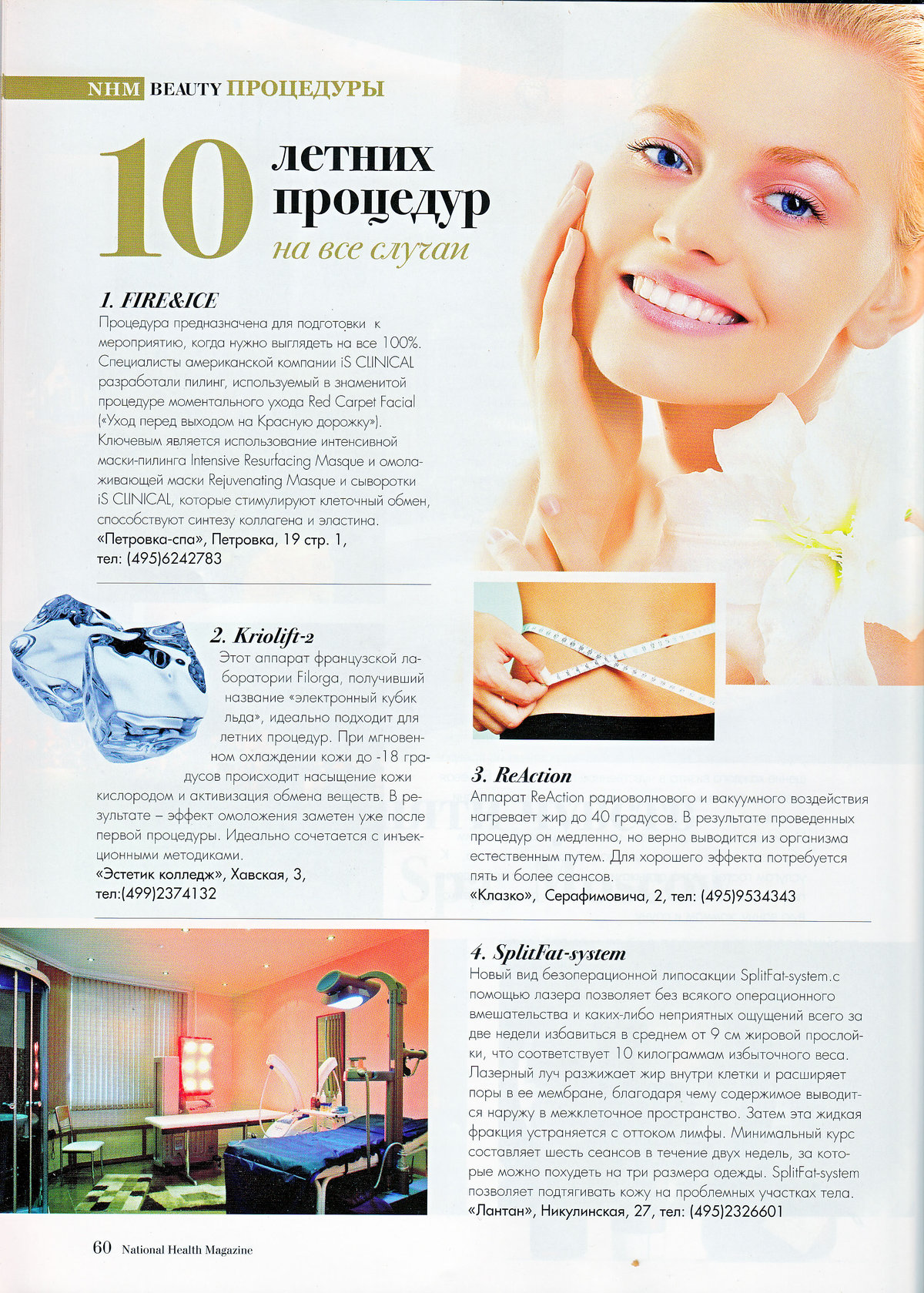 Новый вид безоперационной липосакции SplitFat-system. c помощью лазера позволяет без всякого операционного вмешательства и каких-либо неприятных ощущений всего за две недели избавиться в среднем от 9 см жировой прослойки, что соответствует 10 килограммам избыточного веса. Лазерный луч разжижает жир внутри клетки и расширяет поры в ее мембране, благодаря чему содержимое выводится наружу в межклеточное пространство. Затем эта жидкая фракция устраняется с оттоком лимфы. Минимальный курс составляет шесть сеансов в течение двух недель, за которые можно похудеть на три размера одежды. SplifFat-system позволяет подтягивать кожу на проблемных участках тела. «Лантан», Никулинская, 27, тел: (495)2326601