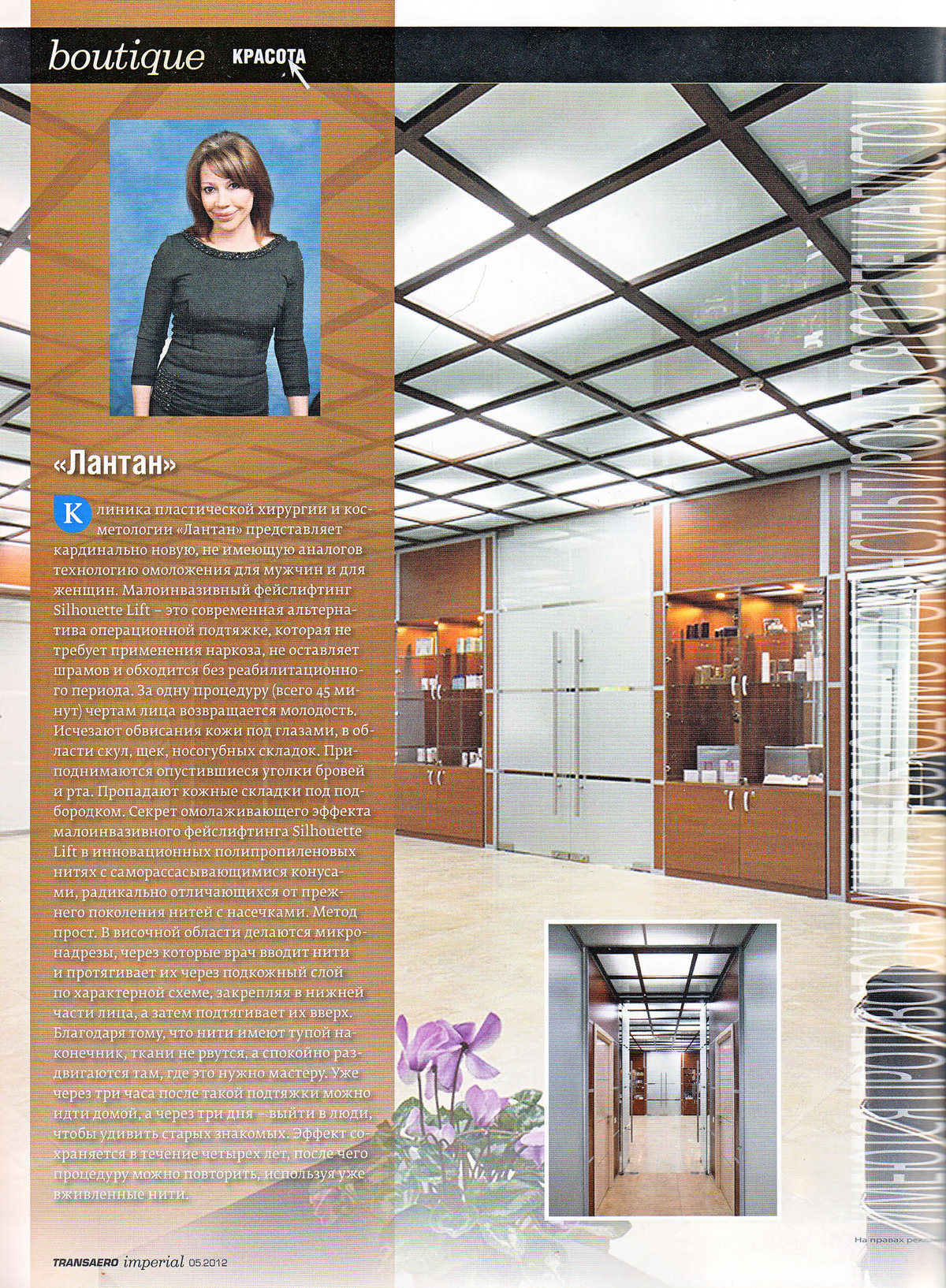 Клиника пластической хирургии и косметологии "Лантан" представляет кардинально новую, не имеющую аналогов технологию омоложения для мужчин и женщин. Малоинвазивный фейслифтинг Silhouette Lift - это современная альтернатива операционной подтяжке, которая не требует применения наркоза, не оставляет шрамов и обходится без реабилитационного периода. За одну процедуру (всего 45 минут) чертам лица возвращается молодость. Исчезают обвисания кожи под глазами, в области скул, щек, носогубных складок. Приподнимаются опустившиеся уголки бровей и рта. Пропадают кожные складки под подбородком. Секрет омолаживающего эффекта малоинвазивного фейслифтинга Silhouette Lift в инновационных полипропиленовых нитях с саморассасывающимися конусами, радикально отличающихся от прежнего поколения нитей с насечками. Метод прост. В височной области делают микронадрезы, через которые врач вводит нити и протягивает их через подкожный слой по характерной схеме, закрепляя в нижней части лица, а затем подтягивает их вверх. Благодаря тому, что нити имеют тупой наконечник, ткани не рвутся, а спокойно раздвигаются там, где это нужно мастеру. Уже через три часа после такой подтяжки можно идти домой, а чрез три дня - выйти в люди, чтобы удивить старых знакомых. Эффект сохраняется в течение четырех лет, после чего процедуру можно повторить, используя уже вживленные нити.