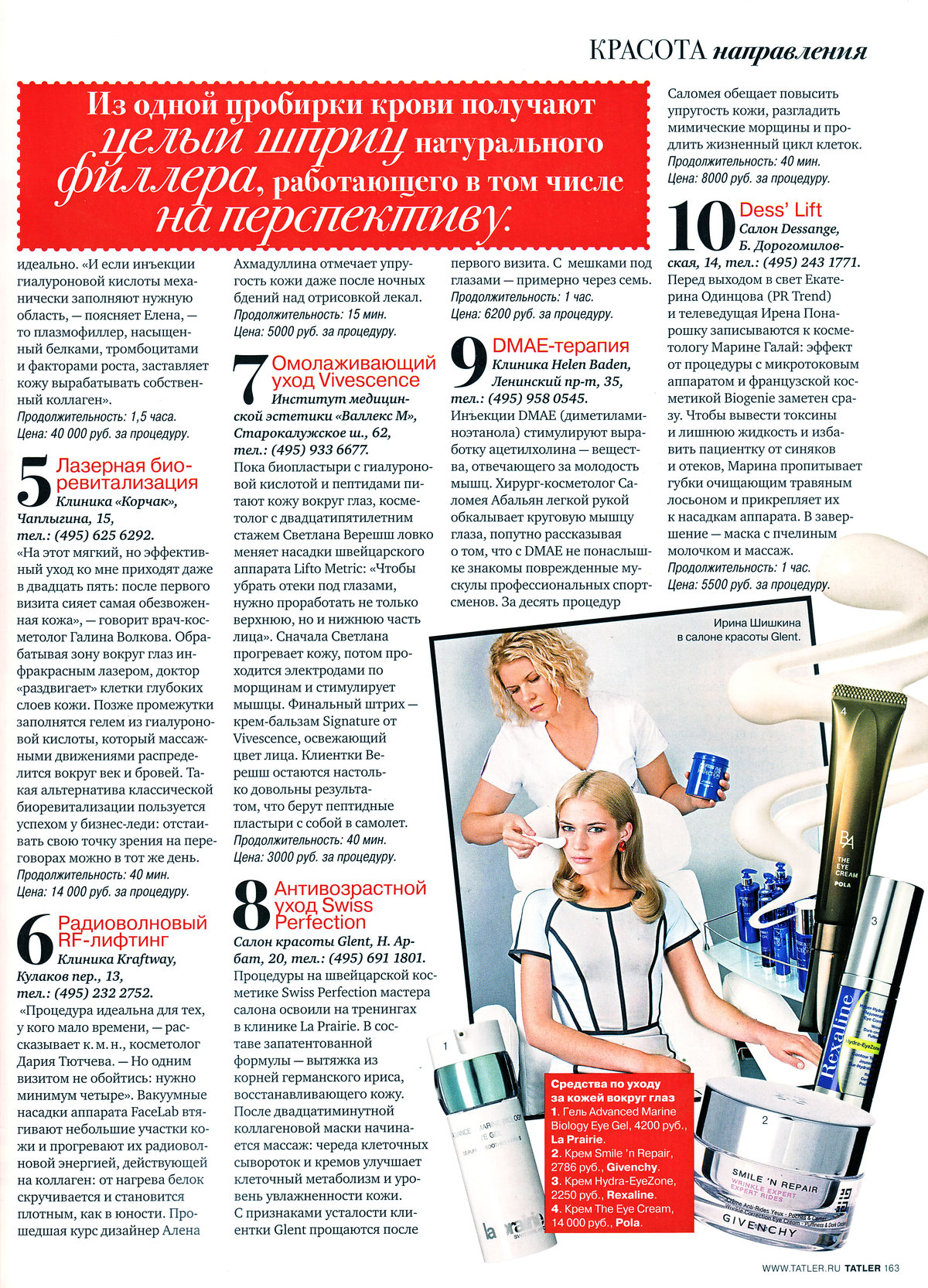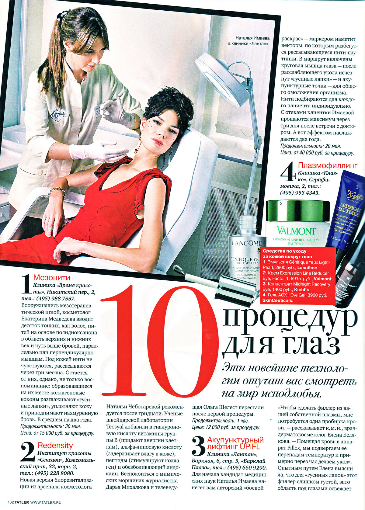 Для начала кандидат медицинских наук Наталья Имаева нанесет вам авторский «боевой раскрас» — маркером наметит векторы, по которым разбегутся рассасывающиеся нити-паутинки. В маршрут включены круговая мышца глаза — посте расслабляющего укола исчезнут «гусиные лапки» — и акупунктурные точки — для общего омоложения организма. Нити подбираются для каждого пациента индивидуально. С отеками клиентки Имаевой прощаются максимум через три дня после встречи с доктором. А вот эффектом наслаждаются два года. Продолжительность: 20 мин. Цена: от 40 000 руб. за процедуру.