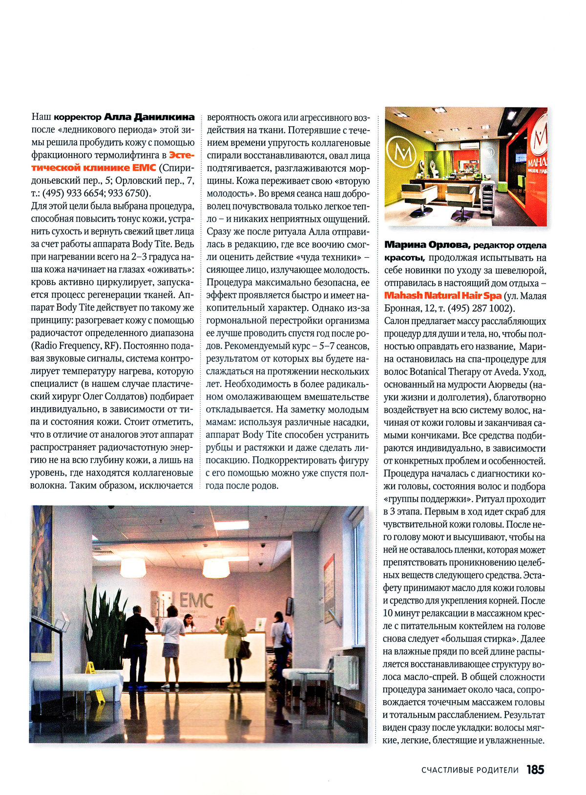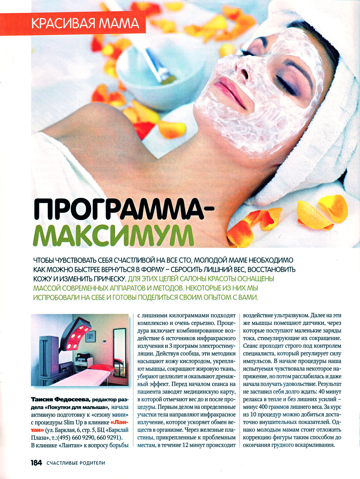 ЧТОБЫ ЧУВСТВОВАТЬ СЕБЯ СЧАСТЛИВОЙ НА ВСЕ СТО, МОЛОДОЙ МАМЕ НЕОБХОДИМО КАК МОЖНО БЫСТРЕЕ ВЕРНУТЬСЯ В ФОРМУ - СБРОСИТЬ ЛИШНИЙ ВЕС, ВОССТАНОВИТЬ КОЖУ И ИЗМЕНИТЬ ПРИЧЕСКУ. ДЛЯ ЭТИХ ЦЕЛЕЙ САЛОНЫ КРАСОТЫ ОСНАЩЕНЫ МАССОЙ СОВРЕМЕННЫХ АППАРАТОВ И МЕТОДОВ. НЕКОТОРЫЕ ИЗ НИХ МЫ ИСПРОБОВАЛИ НА СЕБЕ И ГОТОВЫ ПОДЕЛИТЬСЯ СВОИМ ОПЫТОМ С ВАМИ.