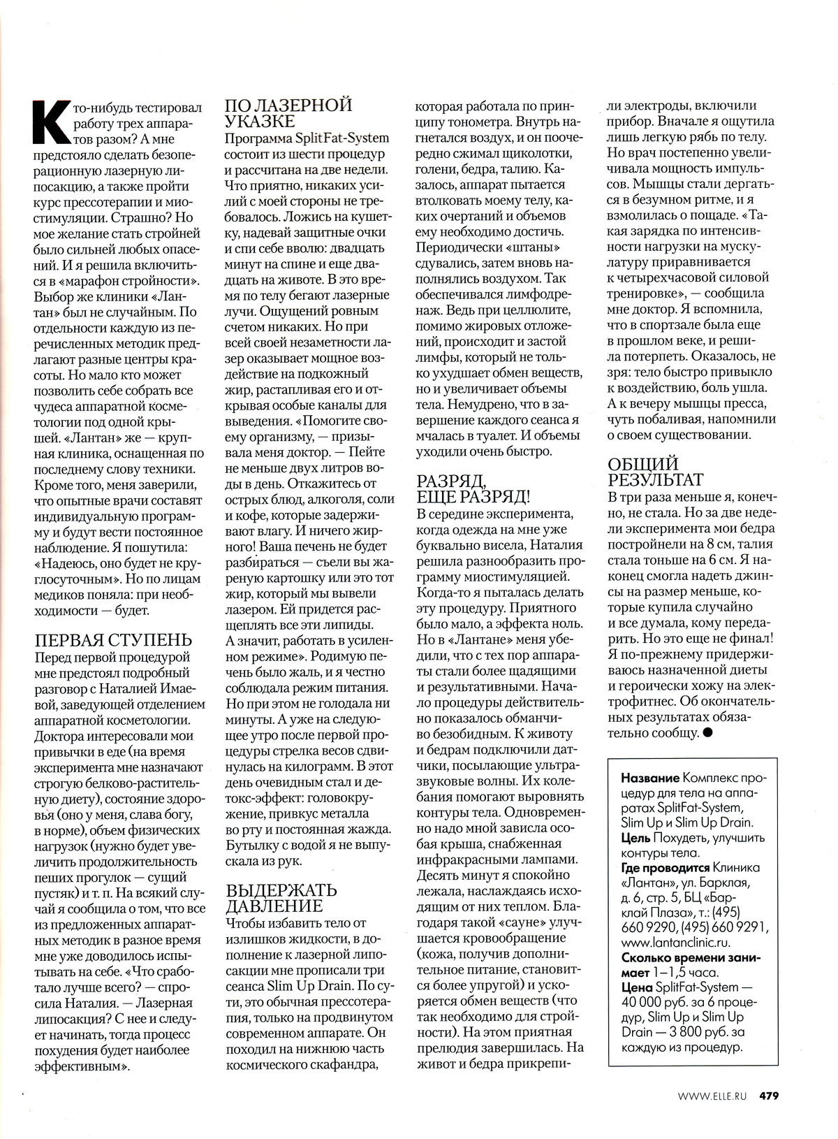 Перед первой процедурой мне предстоял подробный разговор с Наталией Имаевой, заведующей отделением аппаратной косметологии. Доктора интересовали мои привычки в еде (на время эксперимента мне назначают строгую белково-растительную диету), состояние здоровья (оно у меня, слава богу, в норме), объем физических нагрузок (нужно будет увеличить продолжительность пеших прогулок — сущий пустяк) и т. п. На всякий случай я сообщила о том, что все из предложенных аппаратных методик в разное время мне уже доводилось испытывать на себе. «Что сработало лучше всего? — спросила Наталия. — Лазерная липосакция? С нее и следует начинать, тогда процесс похудения будет наиболее эффективным».
