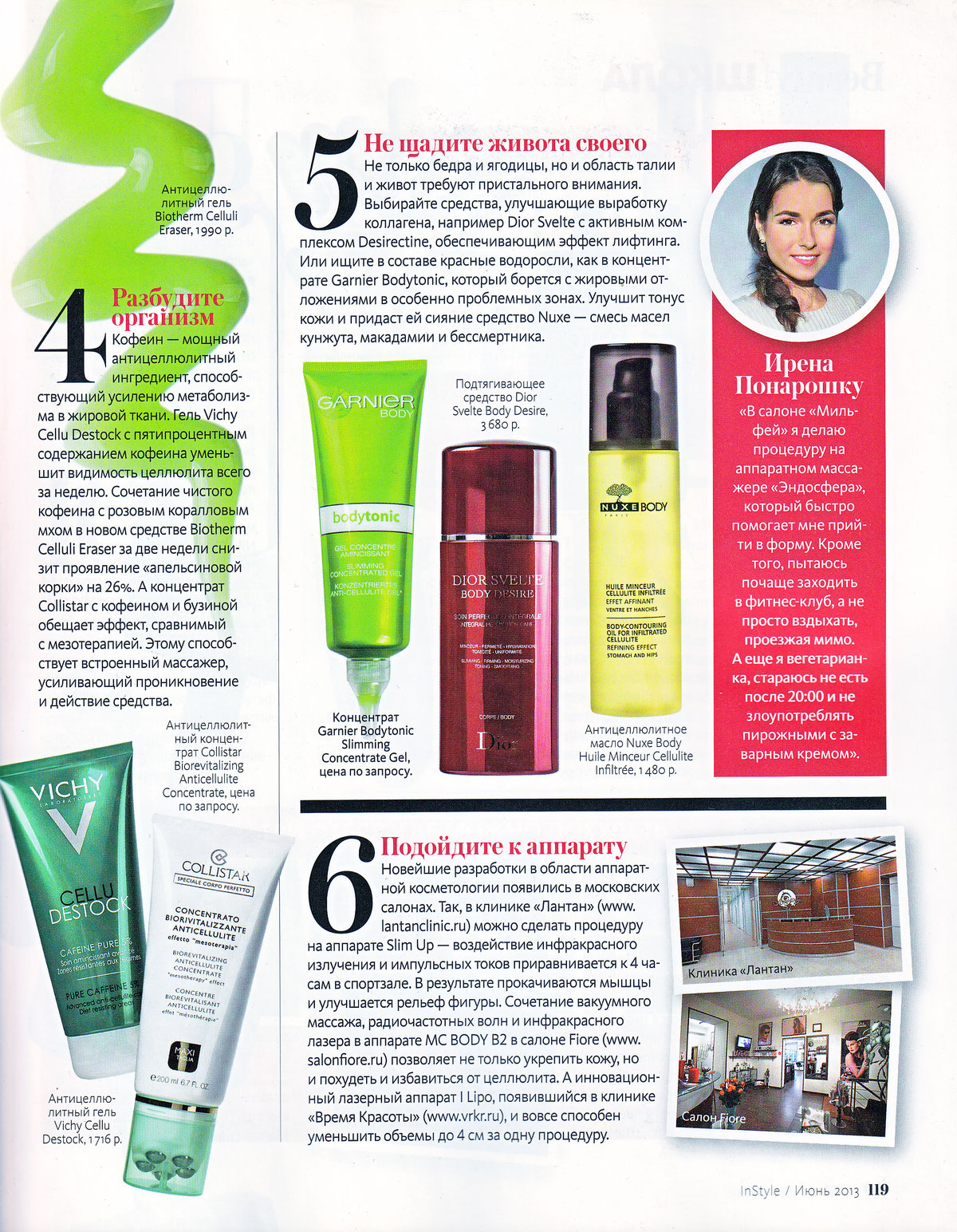 Новейшие разработки в области аппаратной косметологии появились в московских салонах. Так, в клинике «Лантан» (www. lantanclinic.ru) можно сделать процедуру на аппарате Slim Up — воздействие инфракрасного излучения и импульсных токов приравнивается к 4 часам в спортзале. В результате прокачиваются мышцы и улучшается рельеф фигуры. Сочетание вакуумного массажа, радиочастотных волн и инфракрасного лазера в аппарате МС BODY В2 в салоне Fiore (www.salonfiore.ru) позволяет не только укрепить кожу, но и похудеть и избавиться от целлюлита. А инновационный лазерный аппарат I Lipo, появившийся в клинике «Время Красоты» (www.vrkr.ru), и вовсе способен уменьшить объемы до 4 см за одну процедуру.