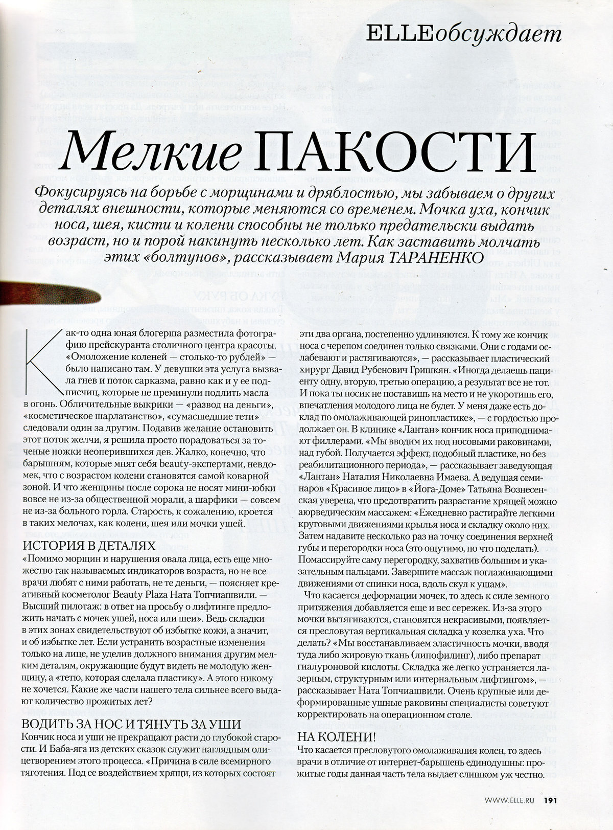 Кончик носа и уши не прекращают расти до глубокой старости. И Баба-яга из детских сказок служит наглядным олицетворением этого процесса. «Причина в силе всемирного тяготения. Под ее воздействием хрящи, из которых состоят эти два органа, постепенно удлиняются. К тому же кончик носа с черепом соединен только связками. Они с годами ослабевают и растягиваются», — рассказывает пластический хирург Давид Рубенович Гришкян. «Иногда делаешь пациенту одну, вторую, третью операцию, а результат все не тот. И пока ты носик не поставишь на место и не укоротишь его, впечатления молодого лица не будет. У меня даже есть доклад по омолаживающей ринопластике», — с гордостью продолжает он. В клинике «Лантан» кончик носа приподнимают филлерами. «Мы вводим их под носовыми раковинами, над губой. Получается эффект, подобный пластике, но без реабилитационного периода», — рассказывает заведующая «Лантан» Наталия Николаевна Имаева. А ведущая семинаров «Красивое лицо» в «Йога-Доме» Татьяна Вознесенская уверена, что предотвратить разрастание хрящей можно аюрведическим массажем: «Ежедневно растирайте легкими круговыми движениями крылья носа и складку около них. Затем надавите несколько раз на точку соединения верхней губы и перегородки носа (это ощутимо, но что поделать). Помассируйте саму перегородку, захватив большим и указательным пальцами. Завершите массаж поглаживающими движениями от спинки носа, вдоль скул к ушам».