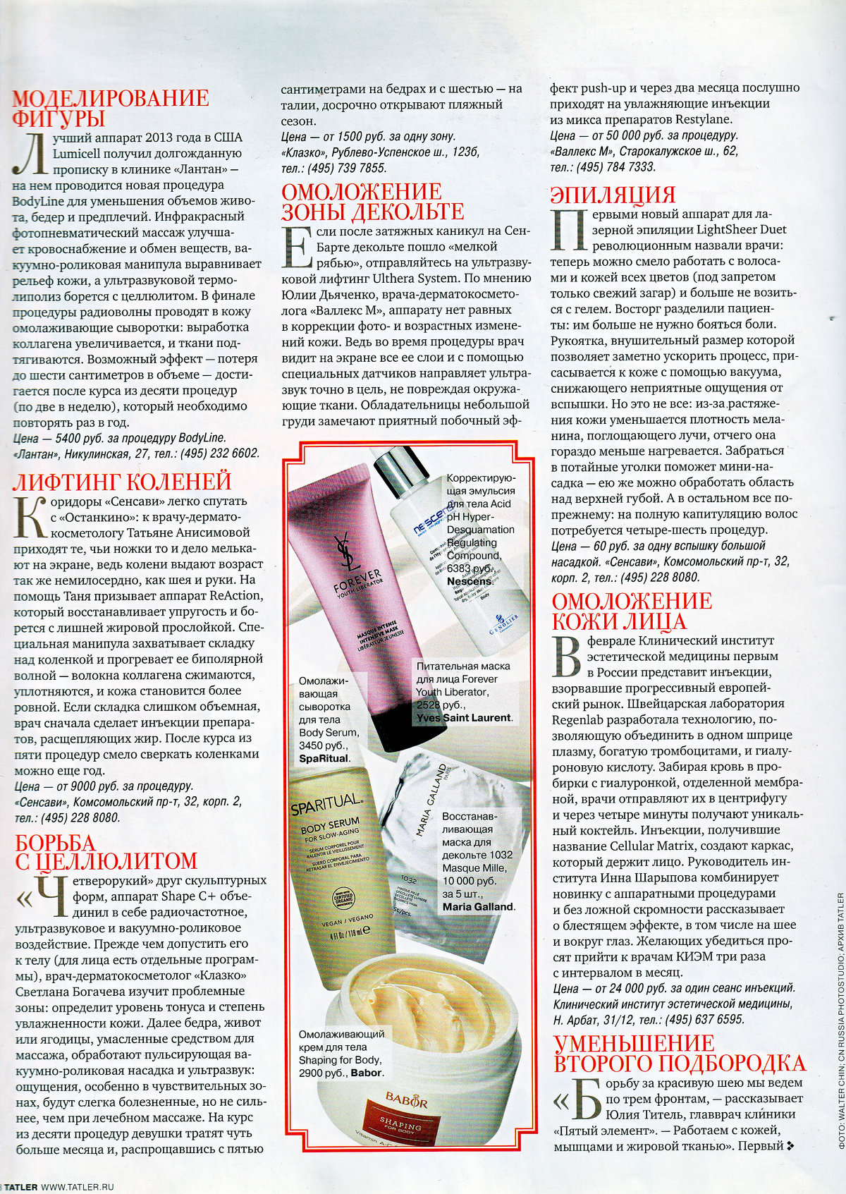 Лучший аппарат 2013 года в США Lumicell получил долгожданную прописку в клинике «Лантан» — на нем проводится новая процедура BodyLine для уменьшения объемов живота, бедер и предплечий. Инфракрасный фотопневматический массаж улучшает кровоснабжение и обмен веществ, вакуумно-роликовая манипула выравнивает рельеф кожи, а ультразвуковой термолиполиз борется с целлюлитом. В финале процедуры радиоволны проводят в кожу омолаживающие сыворотки: выработка коллагена увеличивается, и ткани подтягиваются. Возможный эффект — потеря до шести сантиметров в объеме — достигается после курса из десяти процедур (по две в неделю), который необходимо повторять раз в год. Цена — 5400 руб. за процедуру BodyLine. «Лантан», Никулинская, 27, тел.: (495) 232 6602.
