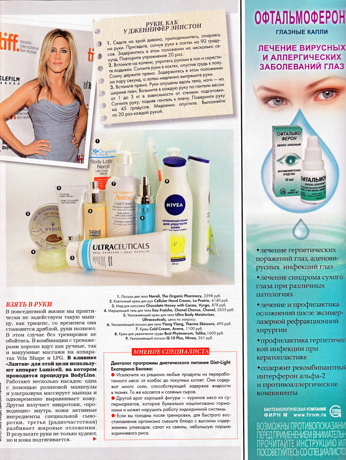 В повседневной жизни мы практически не задействуем такую мышцу, как трицепс, со временем она становится дряблой, руки полнеют. В этом случае без тренировок не обойтись. В комбинации с тренажерами хорошо идут как ручные, так и вакуумные массажи на аппаратах Vela Shape и LPG. В клинике «Лантан» для этой цели используют аппарат Lumicell, на котором проводится процедура BodyLine. Работают несколько насадок: одна с помощью роликовой манипулы и ультразвука массирует мышцы и одновременно выравнивает кожу. Другая излучает микротоки, «проводящие» внутрь кожи активные ингредиенты специальной сыворотки, третья (радиочастотная) разбивает жировые отложения. В результате руки не только худеют, но и кожа подтягивается.