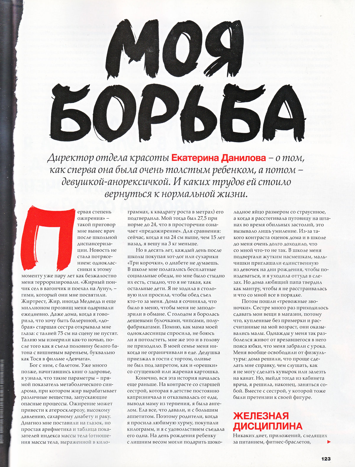 Директор отдела красоты Екатерина Данилова - о том, как сперва она была очень толстым ребенком, а потом -девушкой-анорексичкой. И каких трудов ей стоило вернуться к нормальной жизни.