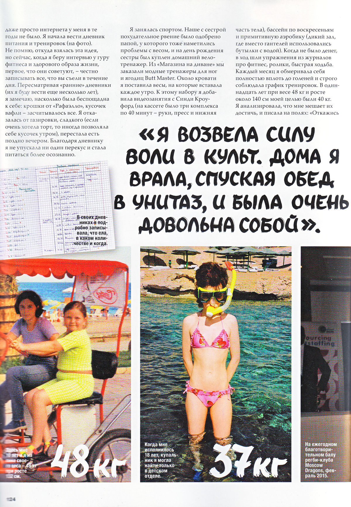 Моя мечта о танцах в итоге осуществилась: я попала в студию балета Тос1ез. фатальной ошибкой было буквальное приятие слов преподавателей, обращенных к одногруппницам с лишним весом: не есть после шести и вообще есть поменьше. С моим комплексом отличницы, «дурным» перфекционизмом это стало началом конца — за 1,5 года при изнуряющих тренировках три раза в неделю и урезанном рационе я превратилась в живой скелет, весила 37 кг при росте 156 см. Мою шею одноклассник обхватывал двумя пальцами, в 16 лет я начала покупать одежду для десятилетнего ребенка, у меня прекратились месячные и начали выпадать волосы. Но мне казалось, что я недостаточно хороша, что у меня выпирает живот. Я опять потеряла связь с одноклассниками и друзьями - все мои мысли были сосредоточены на внешности. Если я ела в четыре часа дня, например мороженое или что-то сладкое, то до следующего утра я запрещала себе есть вовсе. Я возвела свою силу воли в культ, мне надо было что-то контролировать в своей жизни, а контролировать питание было проще всего. Дома я опять врала, что нормально ем, перестав обедать вообще.