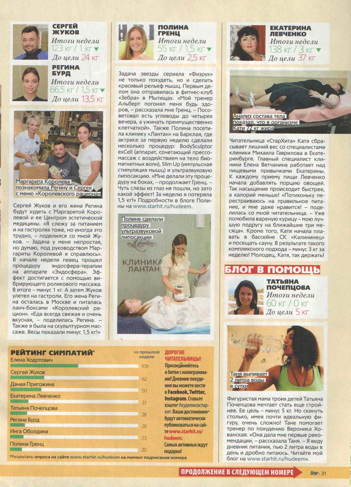 Задача звезды сериала «Физрук» не только похудеть, но и сделать красивый рельеф мышц. Первым делом она отправилась в фитнес-клуб «Зебра» в Мытищах. «Мой тренер Альберт погонял меня будь здоров, - рассказала мне Гренц. - Посоветовал есть углеводы до четырех вечера, а ужинать преимущественно клетчаткой». Также Полина посетила клинику «Лантан» на Барклая, где актрисе за первую неделю сделали несколько процедур: BodySculptor exCell (аппарат, сочетающий прессо- массаж с воздействием на тело био- магнитных волн). Slim Up (импульсная стимуляция мышц) и ультразвуковую липосакцию. «Мне делали эту процедуру на боках, - продолжает Гренц. - Чуть слезы из глаз не пошли, но зато какой эффект! За неделю я потеряла 1,5 кг!»