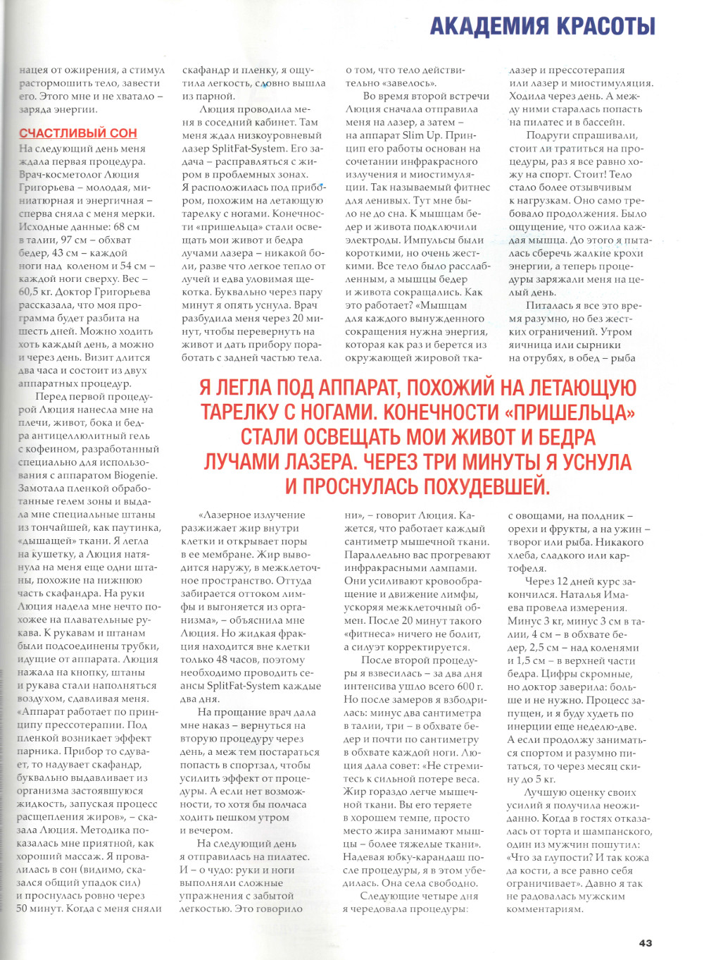 В один прекрасный день я услышала о программе «6 дней стройности» в клинике «Лантан» (60 000 руб.). Программа обещала похудение на один-два размера всего за шесть дней, фантастика? Я готова проверить! Стимул - платья из летней коллекции A La Russe с предельно узкой талией. Первым делом я записалась к заведующей клиникой Наталии Имаевой. Спокойный голос, заботливый взгляд - она меня сразу расположила к себе. Сказала, что моя проблема - пустяк, а занятым девушкам стоит периодически прибегать к аппаратным хитростям. Но сразу предупредила: программа - не панацея от ожирения, а стимул растормошить тело, завести его. Этого мне и не хватало - заряда энергии.