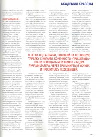 Я расположилась под прибором, похожим на летающую тарелку с ногами. Конечности «пришельца» стали освещать мои живот и бедра лучами лазера - никакой боли, разве что легкое тепло от лучей и едва уловимая щекотка. Буквально через пару минут я опять уснула. Врач разбудила меня через 20 минут, чтобы перевернуть на живот и дать прибору поработать с задней частью тела.