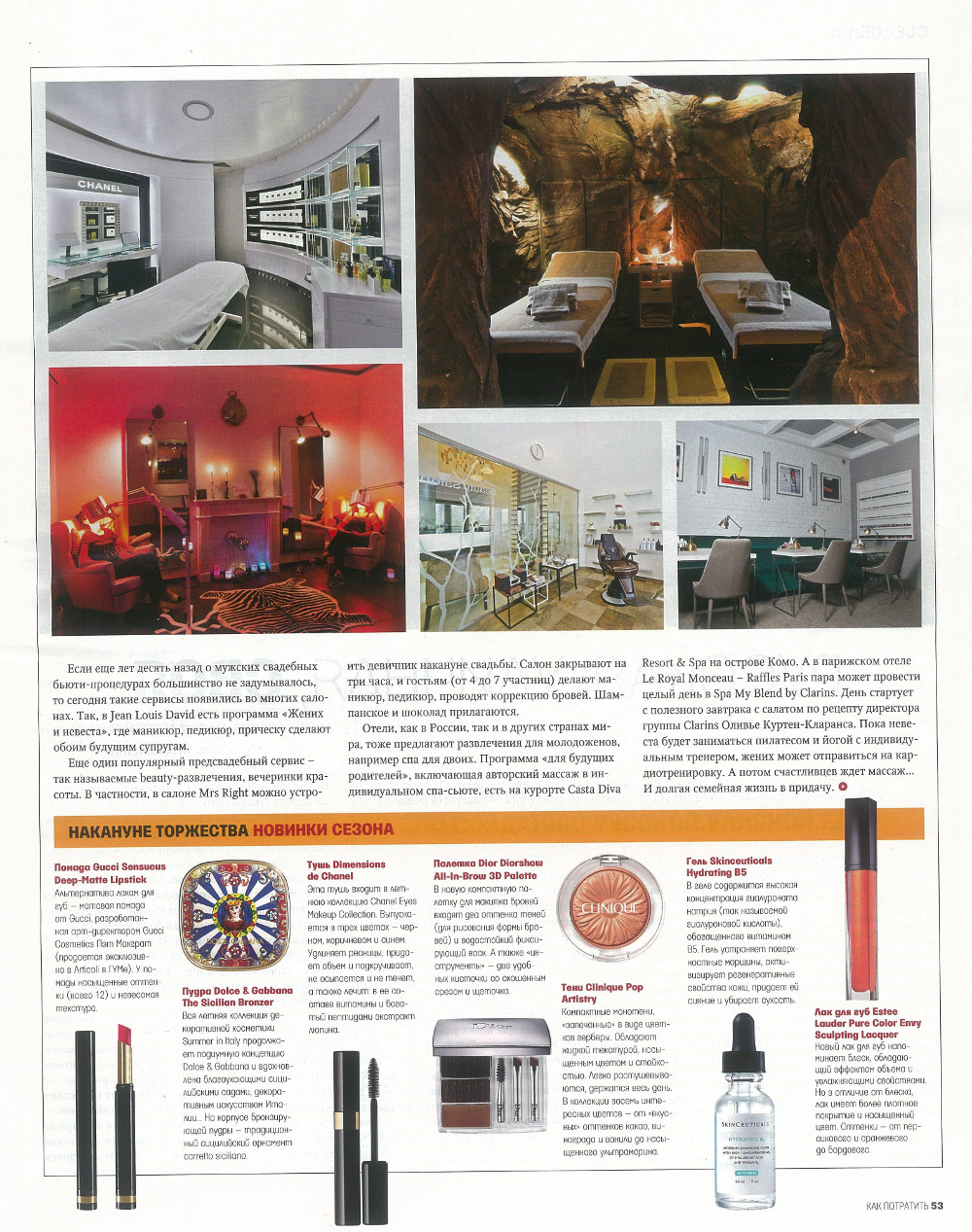 Во многих салонах представлены спа-программы для невест - для сияния кожи и спокойствия души. Например, в Articoli by Bosco можно попробовать «волшебное прикосновение Dior» (сапфировое отшелушивание, выравнивающее структуру кожи, глубокий массаж лица) или «увлажняющий уход за лицом от Chanel» с эффектом лифтинга, скрабированием, массажем, маской.