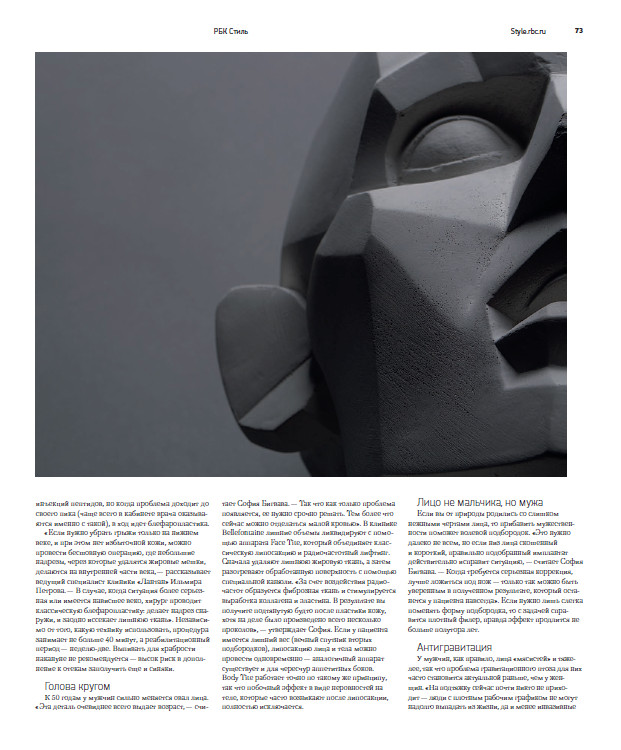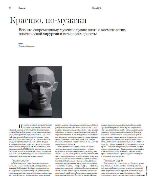 «С каждым годом к нам приходит все больше мужчин», — отмечает София Бигвава, руководитель клиники Ве1ЫоШате. Всеобщее помешательство на здоровом образе жизни вкупе с достижениями медицины тоже дает плоды: продолжительность жизни стала больше, а с ней увеличился и пенсионный возраст мужчин с завидными должностями. «Некоторые клиенты не отходят от дел и в 70-75 лет, — продолжает кандидат медицинских наук. — Они активно работают и отдыхают, выглядеть тоже хотят на свой внутренний возраст. В век конкуренции имеет значение абсолютно все: теперь нужно не только обладать красноречивыми статус-символами, но и самому выглядеть на все сто, а одного костюма, пошитого на заказ, тут недостаточно».