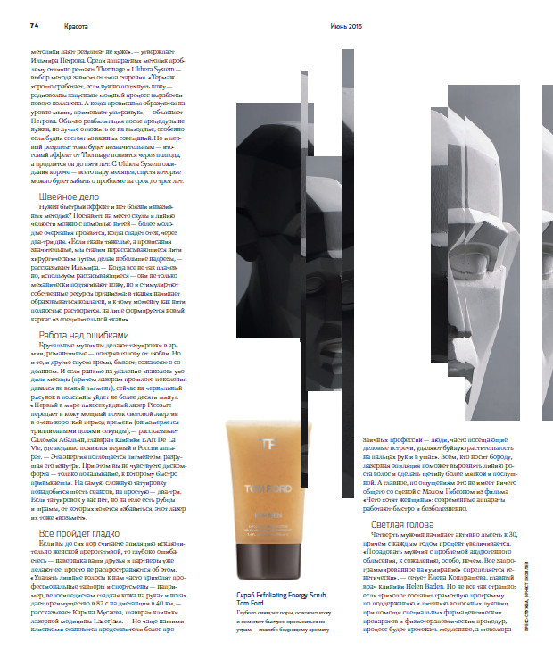 К 50 годам у мужчин сильно меняется овал лица. «Эта деталь очевиднее всего выдает возраст, — считает София Бигвава. — Так что как только проблема появляется, ее нужно срочно решать. Тем более что сейчас можно отделаться малой кровью». В клинике Bellefontaine лишние объемы ликвидируют с помощью аппарата Face Tite, который объединяет классическую липосакцию и радиочастотный лифтинг. Сначала удаляют лишнюю жировую ткань, а затем разогревают обработанную поверхность с помощью специальной канюли. «За счет воздействия радиочастот образуется фиброзная ткань и стимулируется выработка коллагена и эластина. В результате вы получите подтянутую будто после пластики кожу, хотя на деле было произведено всего несколько проколов», — утверждает София. Если у пациента имеется лишний вес (вечный спутник вторых подбородков), липосакцию лица и тела можно провести одновременно — аналогичный аппарат существует и для чересчур аппетитных боков.