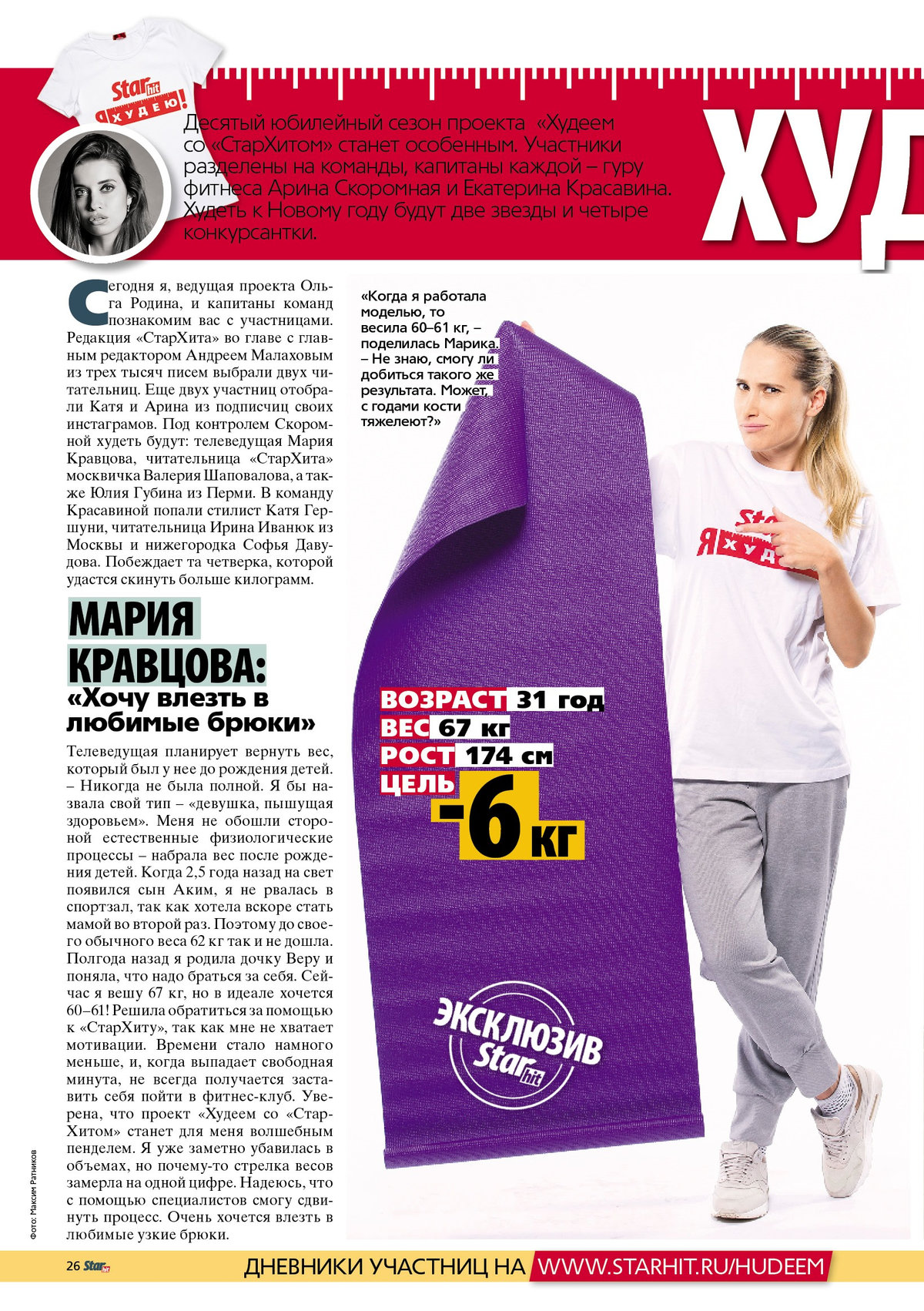Сегодня я, ведущая проекта Ольга Родина, и капитаны команд 1познакомим вас с участницами. Редакция «СтарХита» во главе с главным редактором Андреем Малаховым из трех тысяч писем выбрали двух читательниц. Еще двух участниц отобрали Катя и Арина из подписчиц своих инстаграмов. Под контролем Скоромной худеть будут: телеведущая Мария Кравцова, читательница «СтарХита» москвичка Валерия Шаповалова, а также Юлия Губина из Перми. В команду Красавиной попали стилист Катя Гер- шуни, читательница Ирина Иванюк из Москвы и нижегородка Софья Даву- дова. Побеждает та четверка, которой удастся скинуть больше килограмм.