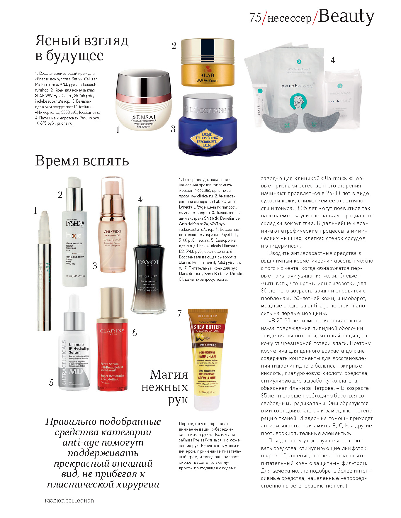 «В 25-30 лет изменения начинаются из-за повреждения липидной оболочки эпидермального слоя, который защищает кожу от чрезмерной потери влаги. Поэтому косметика для данного возраста должна содержать компоненты для восстановления гидролипидного баланса -жирные кислоты, гиалуроновую кислоту, средства, стимулирующие выработку коллагена, - объясняет Ильмира Петрова. - В возрасте 35 лет и старше необходимо бороться со свободными радикалами. Они образуются в митохондриях клеток и замедляют регенерацию тканей. И здесь на помощь приходят антиоксиданты - витамины Е, С, К и другие противоокислительные элементы».
