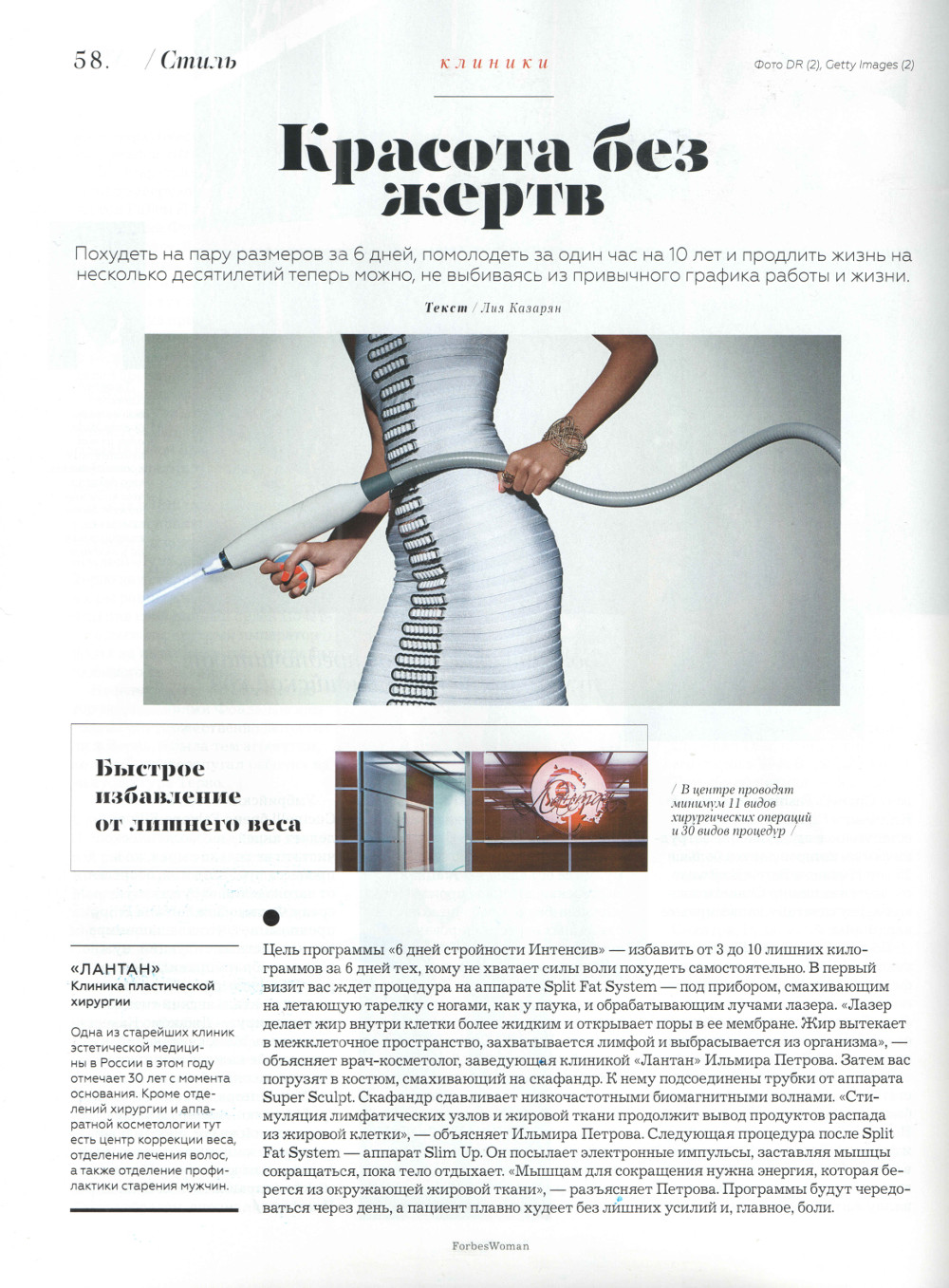 Цель программы «6 дней стройности Интенсив» — избавить от 3 до 10 лишних килограммов за 6 дней тех, кому не хватает силы воли похудеть самостоятельно. В первый визит вас ждет процедура на аппарате Split Fat System — под прибором, смахивающим на летающую тарелку с ногами, как у паука, и обрабатывающим лучами лазера. «Лазер делает жир внутри клетки более жидким и открывает поры в ее мембране. Жир вытекает в межклеточное пространство, захватывается лимфой и выбрасывается из организма», — объясняет врач-косметолог, заведующая клиникой «Лантан» Ильмира Петрова. Затем вас погрузят в костюм, смахивающий на скафандр. К нему подсоединены трубки от аппарата Super Sculpt. Скафандр сдавливает низкочастотными биомагнитными волнами. «Стимуляция лимфатических узлов и жировой ткани продолжит вывод продуктов распада из жировой клетки», — объясняет Ильмира Петрова. Следующая процедура после Split Fat System — аппарат Slim Up. Он посылает электронные импульсы, заставляя мышцы сокращаться, пока тело отдыхает. «Мышцам для сокращения нужна энергия, которая берется из окружающей жировой ткани», — разъясняет Петрова. Программы будут чередоваться через день, а пациент плавно худеет без лйшних усилий и, главное, боли.
