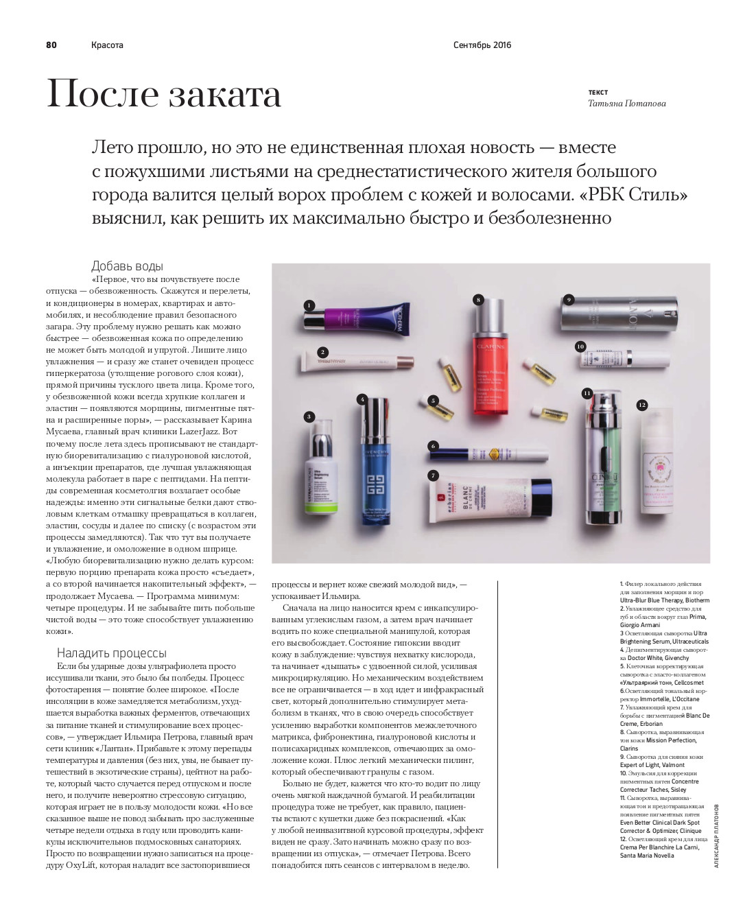 «Первое, что вы почувствуете после отпуска — обезвоженность. Скажутся и перелеты, и кондиционеры в номерах, квартирах и автомобилях, и несоблюдение правил безопасного загара. Эту проблему нужно решать как можно быстрее — обезвоженная кожа по определению не может быть молодой и упругой. Лишите лицо увлажнения — и сразу же станет очевиден процесс гиперкератоза (утолщение рогового слоя кожи), прямой причины тусклого цвета лица. Кроме того, у обезвоженной кожи всегда хрупкие коллаген и эластин — появляются морщины, пигментные пятна и расширенные поры», — рассказывает Карина Мусаева, главный врач клиники LazerJazz. Вот почему после лета здесь прописывают не стандартную биоревитализацию с гиалуроновой кислотой, а инъекции препаратов, где лучшая увлажняющая молекула работает в паре с пептидами. На пептиды современная косметолгия возлагает особые надежды: именно эти сигнальные белки дают стволовым клеткам отмашку превращаться в коллаген, эластин, сосуды и далее по списку (с возрастом эти процессы замедляются). Так что тут вы получаете и увлажнение, и омоложение в одном шприце. «Любую биоревитализацию нужно делать курсом: первую порцию препарата кожа просто «съедает», а со второй начинается накопительный эффект», — продолжает Мусаева. — Программа минимум: четыре процедуры. И не забывайте пить побольше чистой воды — это тоже способствует увлажнению кожи».
