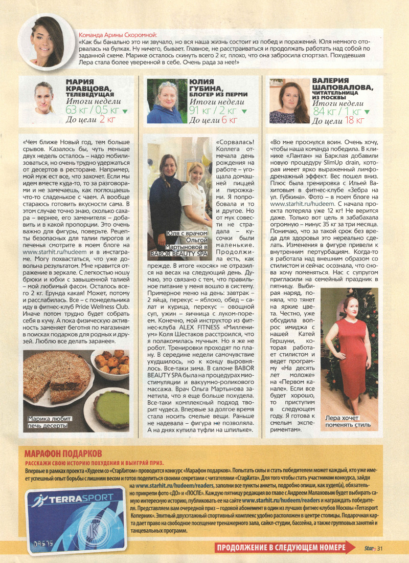 «Как бы банально это ни звучало, но вся наша жизнь состоит из побед и поражений. Юля немного ото- рвалась на булках. Ну ничего, бывает. Главное, не расстраиваться и продолжать работать над собой по заданной схеме. Марике осталось скинуть всего 2 кг; плохо, что она забросила спортзал. Похудевшая Лера стала более уверенной в себе. Очень рада за нее!»