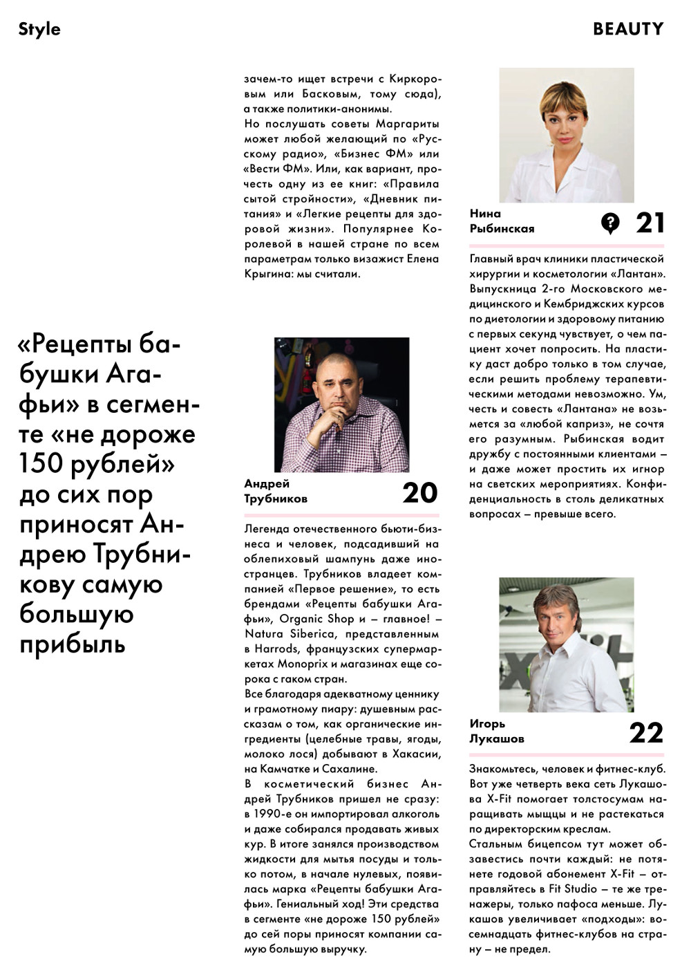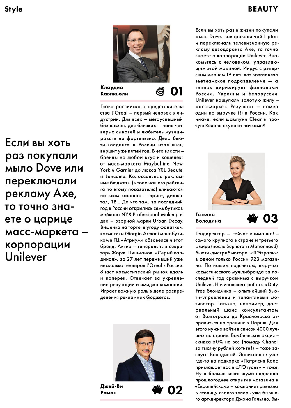 Люди, оказывающие влияние на индустрию красоты в России. Главы бьюти-корпораций. Гендиректора бьюти-брендов. Ключевые дистрибьюторы. Владельцы салонов красоты и главные врачи клиник. Профи: визажисты, стилисты по волосам, тренеры, косметологи и прочие специалисты-индивидуалисты.