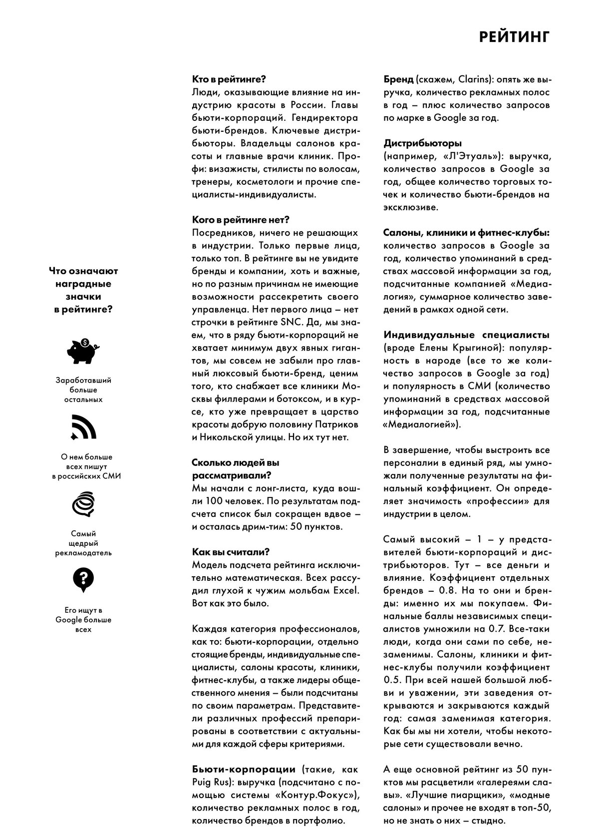 Каждая категория профессионалов, как то: бьюти-корпорации, отдельно стоящие бренды, индивидуальные специалисты, салоны красоты, клиники, фитнес-клубы, а также лидеры общественного мнения - были подсчитаны по своим параметрам. Представители различных профессий препарированы в соответствии с актуальными для каждой сферы критериями.