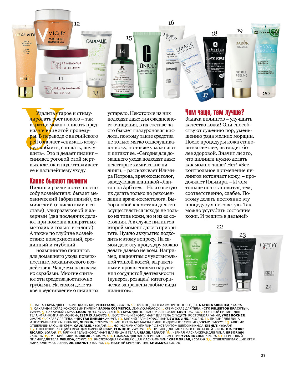 Большинство пилингов для домашнего ухода поверхностные, механического воздействия. Чаще мы называем их скрабами. Многие считают эти средства достаточно грубыми. На самом деле такое представление о пилингах устарело. Некоторые из них подходят даже для ежедневного очищения, в их составе часто бывает гиалуроновая кислота, поэтому такие средства не только мягко отшелушивают кожу, но также увлажняют и питают ее. «Сегодня для домашнего ухода подходят даже некоторые химические пилинги, - рассказывает Ильмира Петрова, врач-косметолог, заведующая клиникой «Лантан на Арбате». - Но я советую их делать только по рекомендации врача-косметолога. Выбор любой косметики должен осуществляться исходя не только из типа кожи, но и из ее состояния. А в случае пилингов второй момент даже в приоритете. Нужно аккуратно подходить к этому вопросу. На самом деле эту процедуру можно делать далеко не всем. Например, пациентам с чувствительной тонкой кожей, выраженными проявлениями нарушения сосудистой деятельности (купероз, розацеа) категорически запрещены любые виды пилингов».