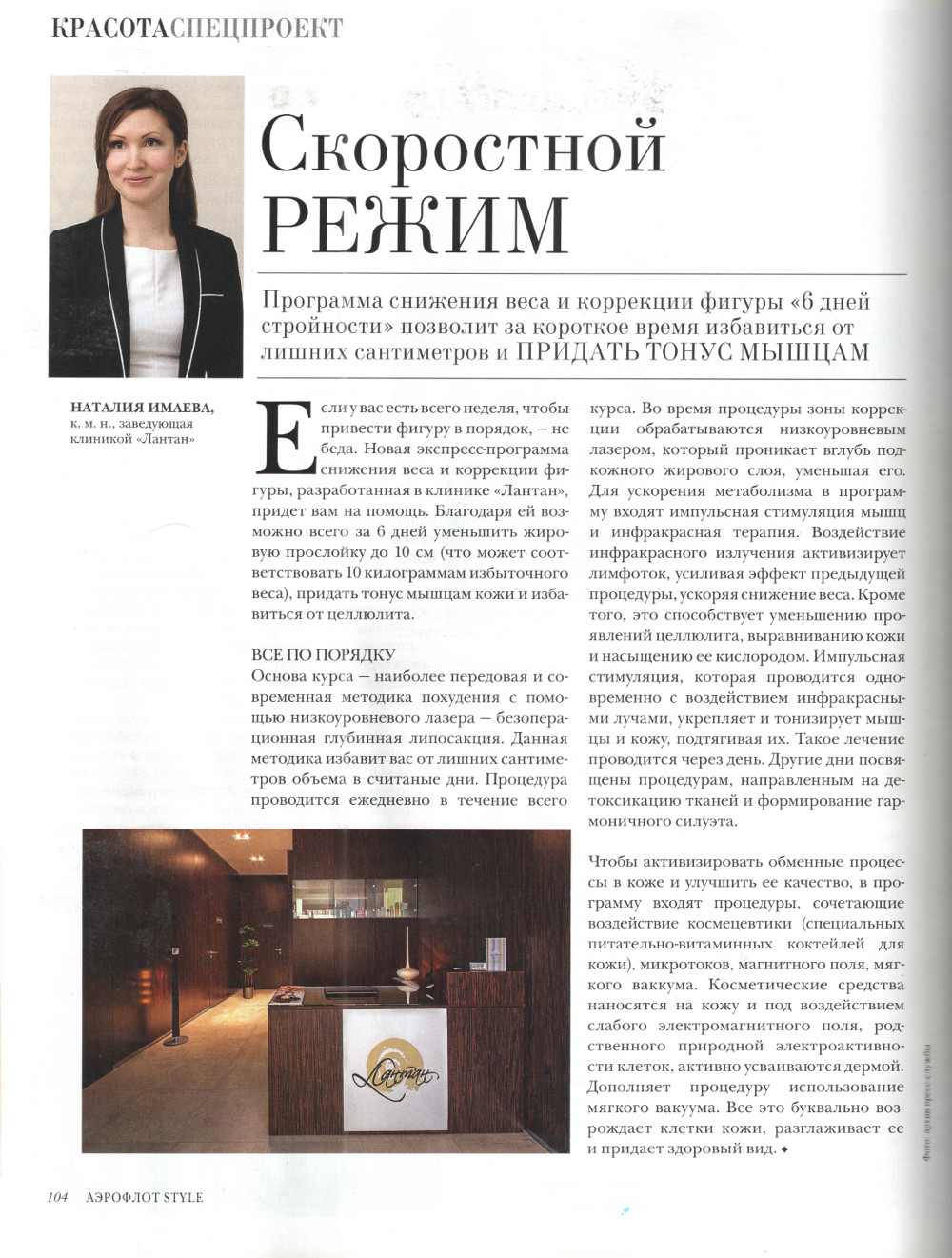 Если у вас есть всего неделя, чтобы привести фигуру в порядок, — не беда. Новая экспресс-программа снижения веса и коррекции фигуры, разработанная в клинике «Лантан», придет вам на помощь. Благодаря ей возможно всего за б дней уменьшить жировую прослойку до 10 см (что может соответствовать 10 килограммам избыточного веса), придать тонус мышцам кожи и избавиться от целлюлита.