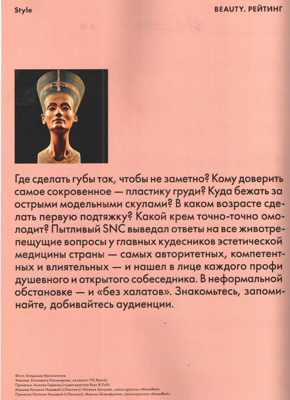 Где сделать губы так, чтобы не заметно? Кому доверить самое сокровенное — пластику груди? Куда бежать за острыми модельными скулами? В каком возрасте сделать первую подтяжку? Какой крем точно-точно омолодит? Пытливый SNC выведал ответы на все животрепещущие вопросы у главных кудесников эстетической медицины страны — самых авторитетных, компетентных и влиятельных — и нашел в лице каждого профи душевного и открытого собеседника. В неформальной обстановке — и «без халатов». Знакомьтесь, запоминайте, добивайтесь аудиенции.