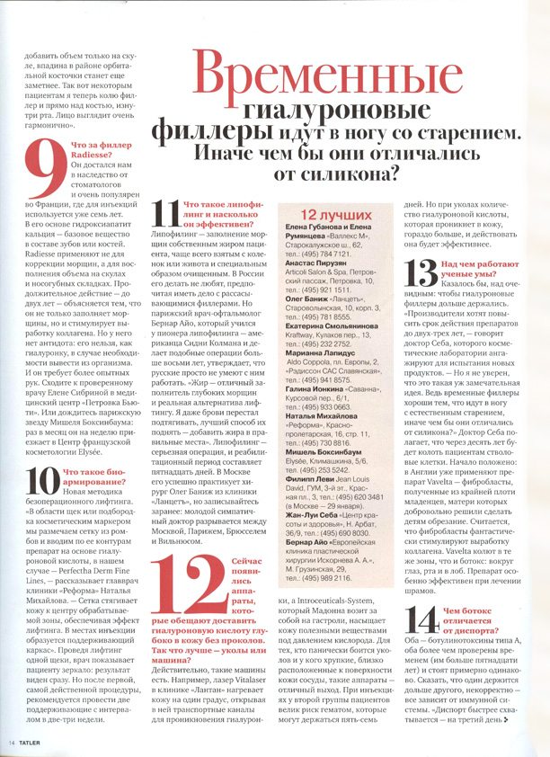 Многие думают, что, каким бы хорошим ни был специалист, есть лимит процедур, превысив который перестаешь выглядеть естественно. Я не верю в лимиты, я верю в руки. Мадонна и Деми Мур сделали кучу операций, но они — красотки, потому что с ними работали профессионалы. Худшая «похвала» пластическому хирургу — когда его пациентке говорят: «Как ты изменилась!» вместо «Как ты помолодела!». Наши клиентки не слышат этого никогда.