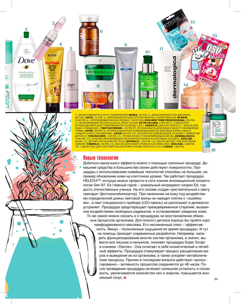 Добиться наилучшего эффекта можно с помощью салонных процедур. Домашние средства в большинстве своем действуют поверхностно. Процедуры с использованием новейших технологий способны на большее, например обновление кожи на клеточном уровне. Так работает процедура HELE04™, которую можно провести в сети клиник инновационной косметологии Gen 87. Ее главный герой - уникальный ингредиент хлорин Е6, гордость отечественных ученых. На его основе создан чувствительный к свету препарат (фотосенсибилизатор). При нанесении на кожу под воздействием определенной длины световой волны он находит клетки с «ошибками», а свет специального прибора (LED-лампы) их распознает и деликатно устраняет. Процедура предотвращает преждевременное старение, вызванное воздействием свободных радикалов, и останавливает увядание кожи. То же самое можно сказать и о процедурах на восстановление обменных процессов организма. Для полного детокса хорошо бы пройти курс лимфодренажного массажа. Его несомненный плюс - эффективность. Минус - болезненные ощущения во время процедуры. И тут на помощь приходят современные разработки. Например, наладить функционирование многих систем организма, а значит, вывести все лишнее и ненужное, поможет процедура Super Sculpt в клинике «Лантан». Она сочетает в себе косметический и лечебный эффекты. Процедура стимулирует процесс расщепления жиров и выведения их из организма, а также ускоряет метаболические процессы. Причем в последнем вопросе действует пролон- гированно - активность процессов сохраняется до 48 часов. После проведения процедуры исчезает излишняя усталость и сонливость, увеличивается количество сил и энергии, повышается жизненный тонус.
