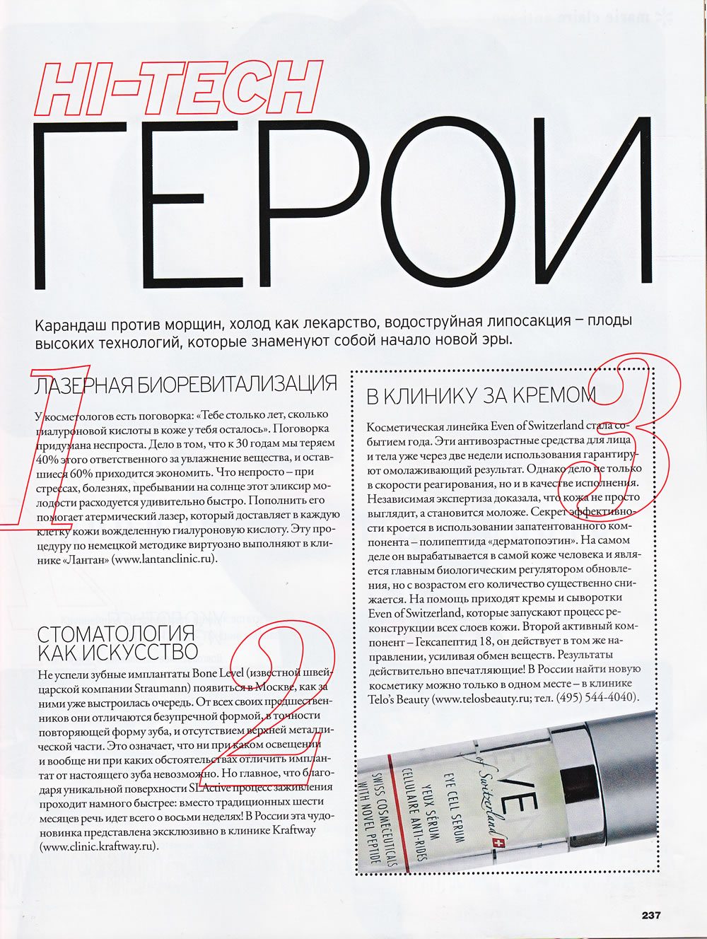У косметологов есть поговорка: «Тебе столько лет, сколько гиалуроновой кислоты в коже у тебя осталось». Поговорка придумана неспроста. Дело в том, что к 30 годам мы теряем 40% эгого ответственного за увлажнение вещества, и остав-шиеся 60% приходится экономить. Что непросто - при стрессах, болезнях, пребывании на солнце этот эликсир мо- лодрсти расходуется удивительно быстро. Пополнить его помогает атермический лазер, который доставляет в каждую клетку кожи вожделенную гиалуроновую кислоту. Эту процедуру по немецкой методике виртуозно выполняют в клинике «Лантан» (www.lantanclinic.ru).