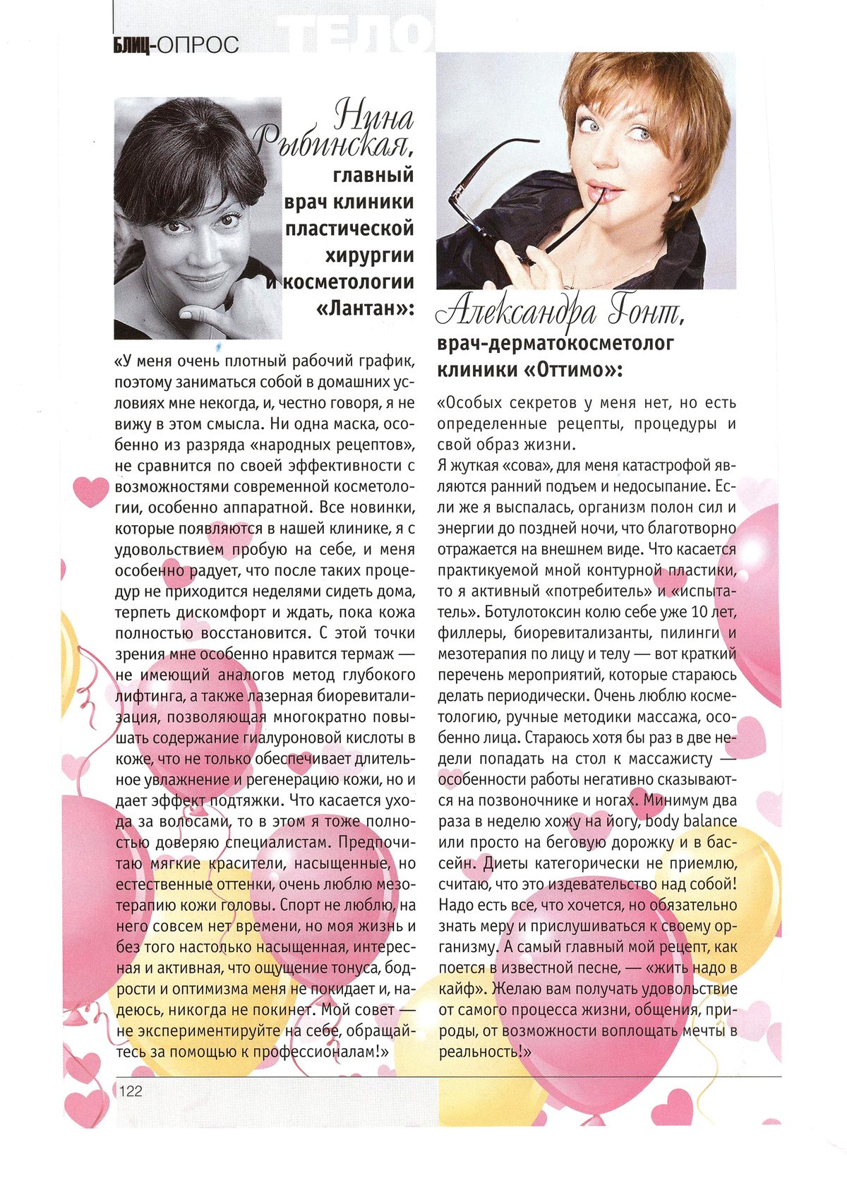 «У меня очень плотный рабочий график, поэтому заниматься собой в домашних условиях мне некогда, и, честно говоря, я не вижу в этом смысла. Ни одна маска, особенно из разряда «народных рецептов», не сравнится по своей эффективности с возможностями современной косметологии, особенно аппаратной. Все новинки, которые появляются в нашей клинике, я с удовольствием пробую на себе, и меня особенно радует, что после таких процедур не приходится неделями сидеть дома, терпеть дискомфорт и ждать, пока кожа полностью восстановится. С этой точки зрения мне особенно нравится термаж — не имеющий аналогов метод глубокого лифтинга, а также лазерная биоревитализация, позволяющая многократно повышать содержание гиалуроновой кислоты в коже, что не только обеспечивает длительное увлажнение и регенерацию кожи, но и дает эффект подтяжки. Что касается ухода за волосами, то в этом я тоже полностью доверяю,специалистам. Предпочитаю мягкие красители, насыщенные, но естественные оттенки, очень люблю мезотерапию кожи головы. Спорт не люблю, на него совсем нет времени, но моя жизнь и без того настолько насыщенная, интересная и активная, что ощущение тонуса, бодрости и оптимизма меня не покидает и, надеюсь, никогда не покинет. Мой совет — не экспериментируйте на себе, обращайтесь за помощью к профессионалам!»