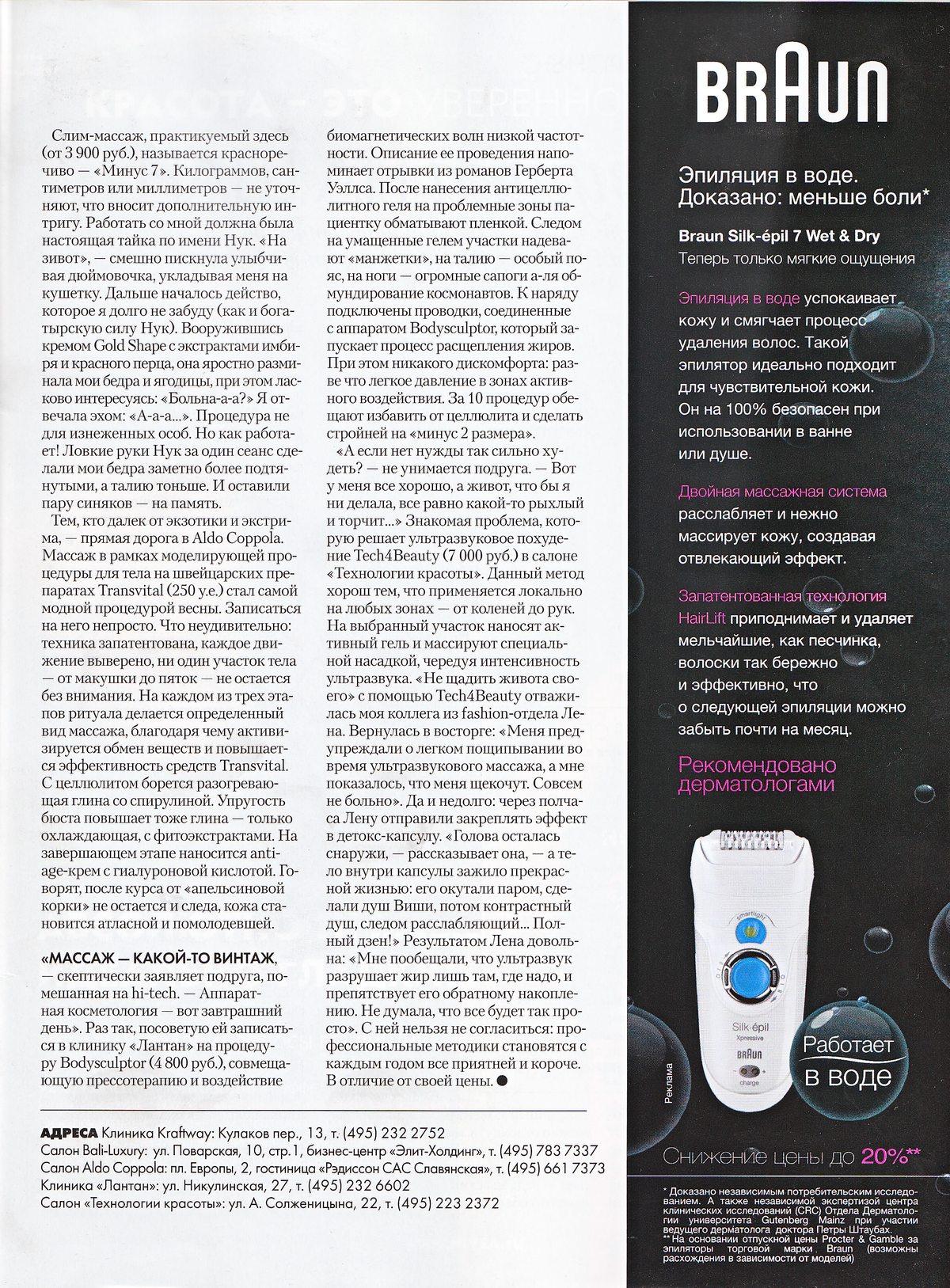 ...«МАССАЖ - КАКОЙ-ТО ВИНТАЖ, — скептически заявляет подруга, помешанная на hi-tech. — Аппаратная косметология — вот завтрашний день». Раз так, посоветую ей записаться в клинику «Лантан» на процедуру Bodysculptor (4 800 руб.), совмещающую прессотерапию и воздействие биомагнетических волн низкой частотности. Описание ее проведения напоминает отрывки из романов Герберта Уэллса. После нанесения антицеллюлитного геля на проблемные зоны пациентку обматывают пленкой. Следом на умащенные гелем участки надевают «манжетки», на талию — особый пояс, на ноги — огромные сапоги а-ля обмундирование космонавтов. К наряду подключены проводки, соединенные с аппаратом Bodysculptor, который запускает процесс расщепления жиров. При этом никакого дискомфорта: разве что легкое давление в зонах активного воздействия. За 10 процедур обещают избавить от целлюлита и сделать стройней на «минус 2 размера».