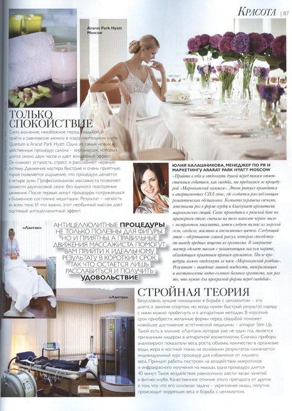 Безусловно, лучшие помощники в борьбе с целлюлитом — это диета и занятия спортом, но, когда нужен быстрый результат, наряду с ними можно прибегнуть и к аппаратным методам. В короткий срок приобрести желанные формы перед свадьбой поможет новейшее достижение эстетической медицины - аппарат Slim Up. Такой есть в клинике «Лантан», которая уже не один год является признанным лидером в аппаратной косметологии. Сначала приборы анализируют показатели веса, роста, объемы, количество в организме воды, жира и костной ткани, на основании результатов назначается индивидуальный курс процедур для избавления от лишнего веса. Принцип работы построен на воздействии микротоков и инфракрасного излучения на мышцы, одна процедура длится 40 минут. Такое воздействие равносильно шести часам занятий в фитнес-клубе. Качественное отличие этого препарата от других в том, что что его основная задача - укрепление мышц, попутно происходит коррекция веса и борьба с целлюлитом.