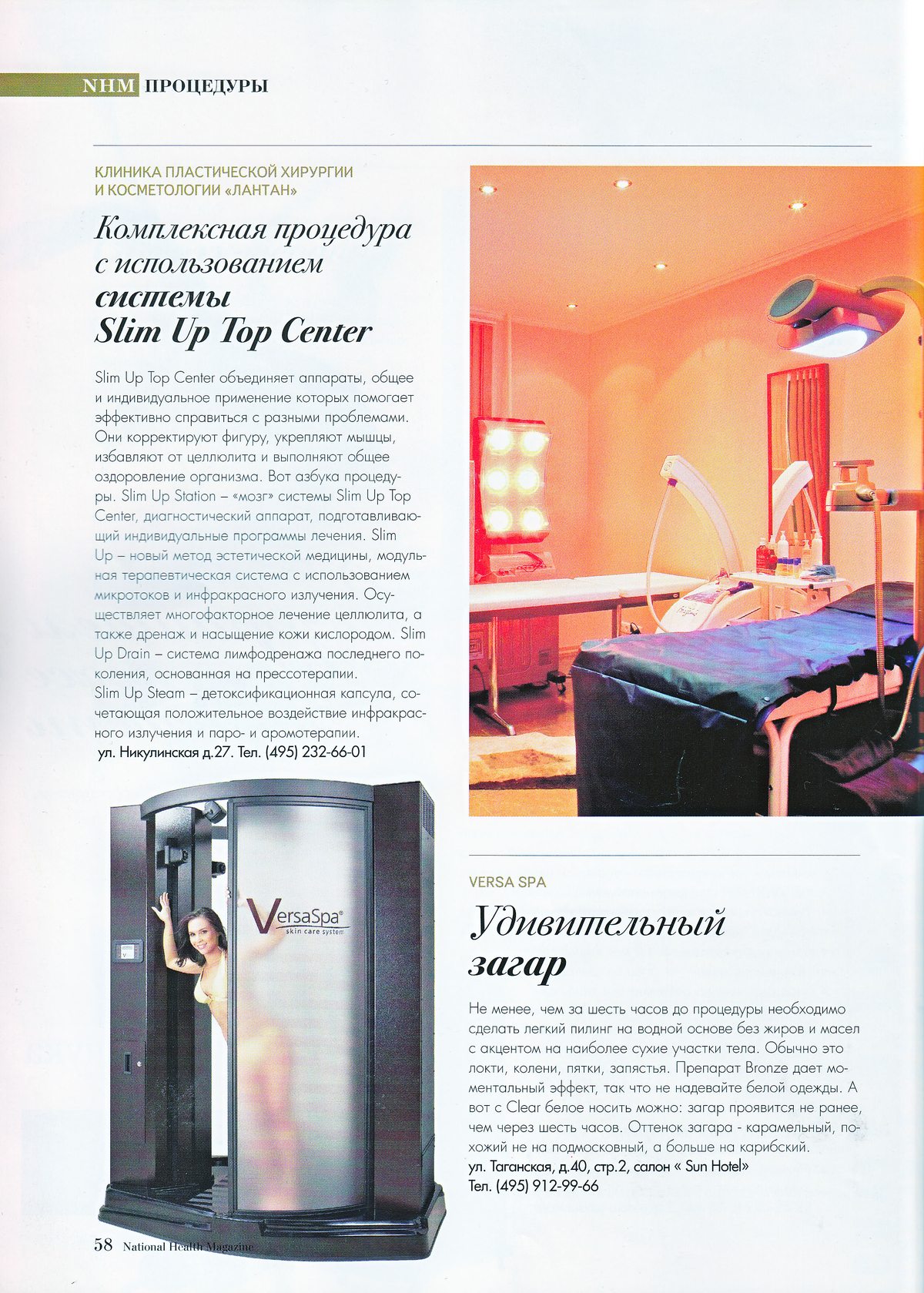 Slim Up Top Center объединяет аппараты, общее и индивидуальное применение которых помогает эффективно справиться с разными проблемами. Они корректируют фигуру, укрепляют мышцы, избавляют от целлюлита и выполняют общее оздоровление организма. Вот азбука процедуры. Slim Up Station - «мозг» системы Slim Up Top Center, диагностический аппарат, подготавливающий индивидуальные программы лечения. Slim Up - новый метод эстетической медицины, модульная терапевтическая система с использованием микротоков и инфракрасного излучения. Осуществляет многофакторное лечение целлюлита, а также дренаж и насыщение кожи кислородом. Slim Up Drain - система лимфодренажа последнего поколения, основанная на прессотерапии. Slim Up Steam - детоксификационная капсула, сочетающая положительное воздействие инфракрасного излучения и паро- и аромотерапии.
