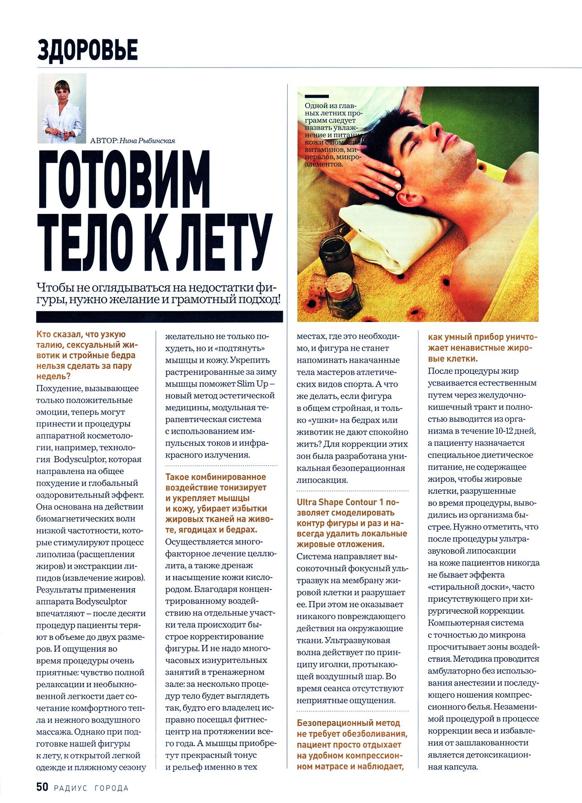Кто сказал, что узкую талию, сексуальный животик и стройные бедра нельзя сделать за пару недель? Похудение, вызывающее только положительные эмоции, теперь могут принести и процедуры аппаратной косметологии, например, технология Bodysculptor, которая направлена на общее похудение и глобальный оздоровительный эффект. Она основана на действии биомагнетических волн низкой частотности, которые стимулируют процесс липолиза (расщепления жиров) и экстракции липидов (извлечение жиров). Результаты применения аппарата Bodysculptor впечатляют - после десяти процедур пациенты теряют в объеме до двух размеров. И ощущения во время процедуры очень приятные: чувство полной релаксации и необыкновенной легкости дает сочетание комфортного тепла и нежного воздушного массажа. Однако при подготовке нашей фигуры к лету, к открытой легкой одежде и пляжному сезону желательно не только похудеть, но и «подтянуть» мышцы и кожу. Укрепить растренированные за зиму мышцы поможет Slim Up -новый метод эстетической медицины, модульная терапевтическая система с использованием импульсных токов и инфракрасного излучения.