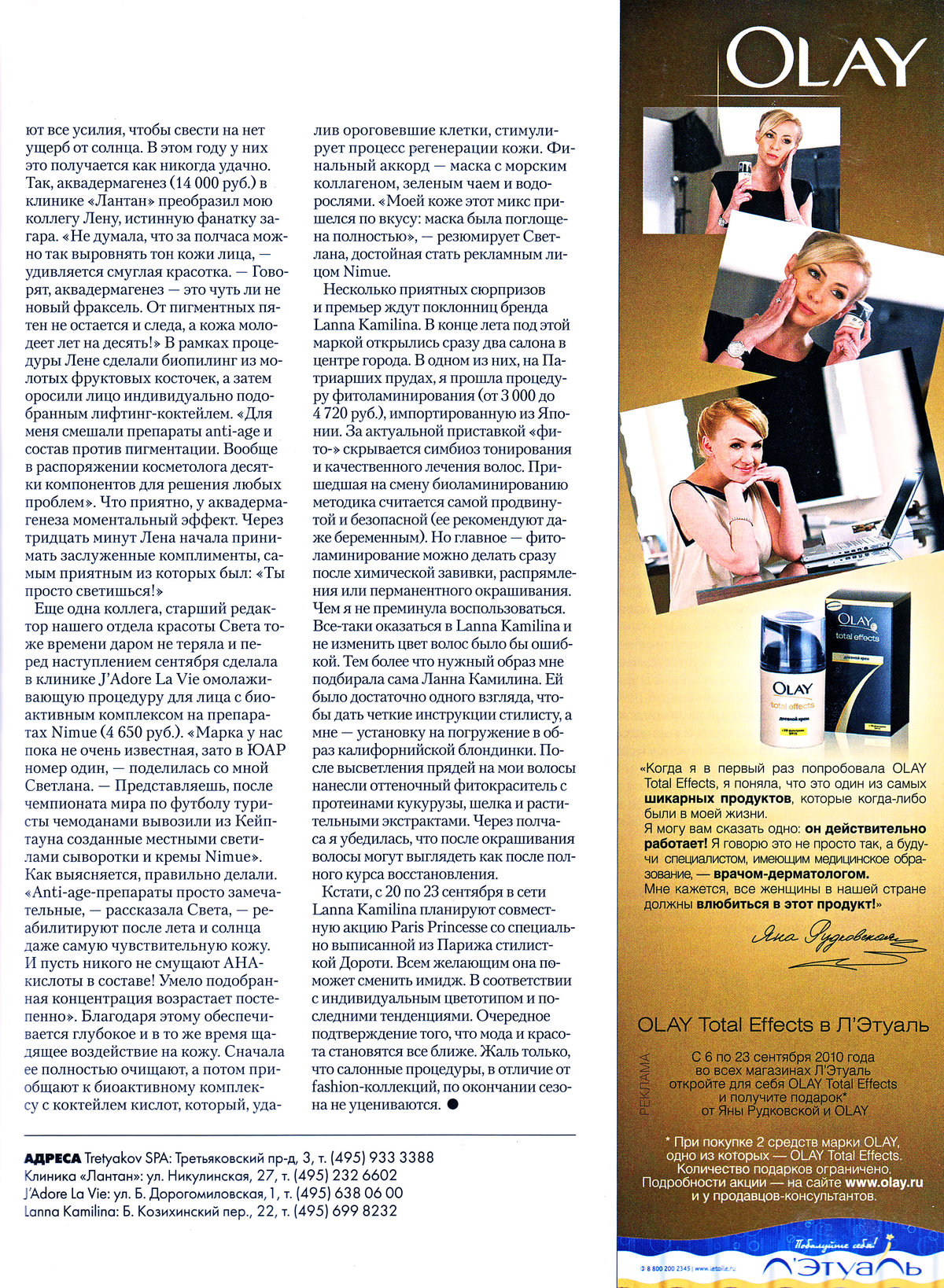 помогают, как выражается моя подруга, «замаливать отпускные грехи». Создатели точно знают, что мы делали этим летом, а потому прилагают все усилия, чтобы свести на нет ущерб от солнца. В этом году у них это получается как никогда удачно. Так, аквадермагенез (14 000 руб.) в клинике «Лантан» преобразил мою коллегу Лену, истинную фанатку загара. «Не думала, что за полчаса можно так выровнять тон кожи лица, — удивляется смуглая красотка. — Говорят, аквадермагенез — это чуть ли не новый фраксель. От пигментных пятен не остается и следа, а кожа молодеет лет на десять!» В рамках процедуры Лене сделали биопилинг из молотых фруктовых косточек, а затем оросили лицо индивидуально подобранным лифтинг-коктейлем. «Для меня смешали препараты anti-age и состав против пигментации. Вообще в распоряжении косметолога десятки компонентов для решения любых проблем». Что приятно, у аквадермагенеза моментальный эффект. Через тридцать минут Лена начала принимать заслуженные комплименты, самым приятным из которых был: «Ты просто светишься!»